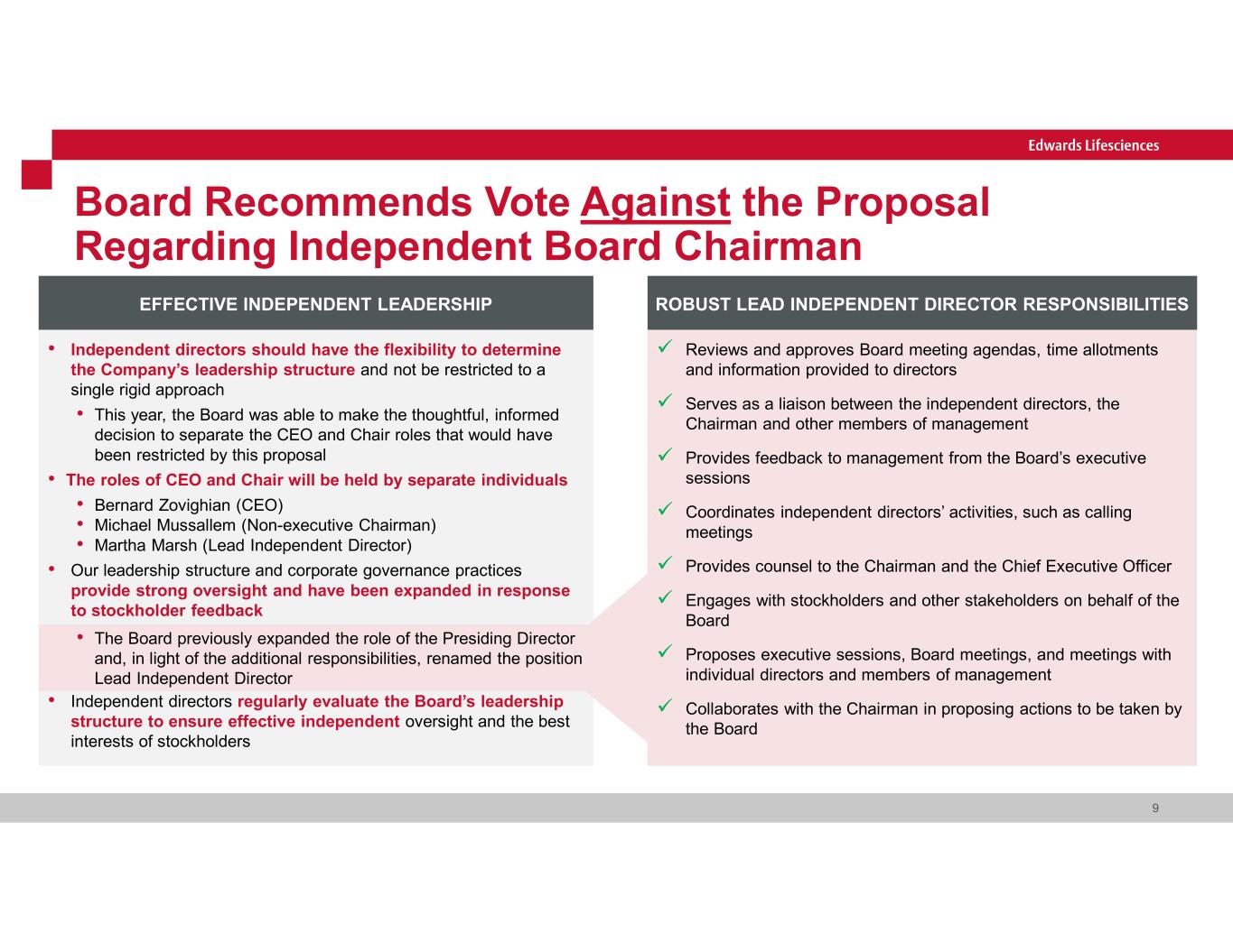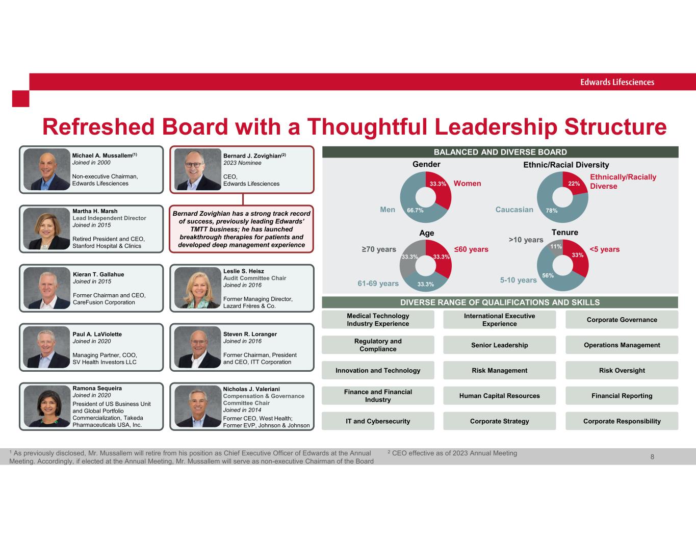 33% 56% 11% Tenure 33.3% 66.7% Gender Men Women Refreshed Board with a Thoughtful Leadership Structure 8 Michael A. Mussallem(1) Joined in 2000 Non-executive Chairman, Edwards Lifesciences Bernard J. Zovighian(2) 2023 Nominee CEO, Edwards Lifesciences Medical Technology Industry Experience International Executive Experience Corporate Governance Risk Management Risk Oversight Senior Leadership Innovation and Technology Corporate Responsibility Operations Management Corporate StrategyIT and Cybersecurity Regulatory and Compliance DIVERSE RANGE OF QUALIFICATIONS AND SKILLS 33.3% 33.3% 33.3% Age <5 years 5-10 years >10 years ≤60 years 61-69 years ≥70 years BALANCED AND DIVERSE BOARD 22% 78% Ethnic/Racial Diversity Ethnically/Racially Diverse Caucasian Human Capital Resources Financial Reporting Finance and Financial Industry Martha H. Marsh Lead Independent Director Joined in 2015 Retired President and CEO, Stanford Hospital & Clinics Kieran T. Gallahue Joined in 2015 Former Chairman and CEO, CareFusion Corporation Leslie S. Heisz Audit Committee Chair Joined in 2016 Former Managing Director, Lazard Frères & Co. Paul A. LaViolette Joined in 2020 Managing Partner, COO, SV Health Investors LLC Steven R. Loranger Joined in 2016 Former Chairman, President and CEO, ITT Corporation Ramona Sequeira Joined in 2020 President of US Business Unit and Global Portfolio Commercialization, Takeda Pharmaceuticals USA, Inc. Nicholas J. Valeriani Compensation & Governance Committee Chair Joined in 2014 Former CEO, West Health; Former EVP, Johnson & Johnson 1 As previously disclosed, Mr. Mussallem will retire from his position as Chief Executive Officer of Edwards at the Annual Meeting. Accordingly, if elected at the Annual Meeting, Mr. Mussallem will serve as non-executive Chairman of the Board 2 CEO effective as of 2023 Annual Meeting Bernard Zovighian has a strong track record of success, previously leading Edwards’ TMTT business; he has launched breakthrough therapies for patients and developed deep management experience
