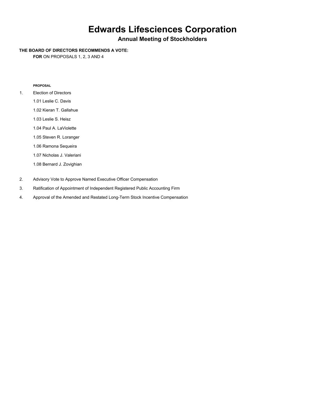 Edwards Lifesciences Corporation Annual Meeting of Stockholders PROPOSAL 1. Election of Directors 1.01 Leslie C. Davis 1.02 Kieran T. Gallahue 1.03 Leslie S. Heisz 1.04 Paul A. LaViolette 1.05 Steven R. Loranger 1.06 Ramona Sequeira 1.07 Nicholas J. Valeriani 1.08 Bernard J. Zovighian 2. Advisory Vote to Approve Named Executive Officer Compensation 3. Ratification of Appointment of Independent Registered Public Accounting Firm 4. Approval of the Amended and Restated Long-Term Stock Incentive Compensation THE BOARD OF DIRECTORS RECOMMENDS A VOTE: FOR ON PROPOSALS 1, 2, 3 AND 4