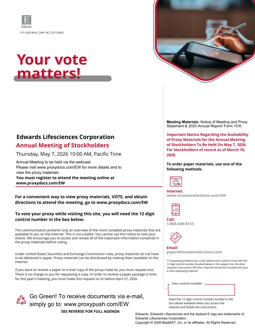 Your control number Your vote matters! Meeting Materials: Notice of Meeting and Proxy Statement & 2025 Annual Report/ Form 10-K Important Notice Regarding the Availability of Proxy Materials for the Annual Meeting of Stockholders To Be Held On May 7, 2026 For Stockholders of record as of March 10, 2026 To order paper materials, use one of the following methods. Internet: www.investorelections.com/EW Call: 1-866-648-8133 Email: paper@investorelections.com * If requesting material by e-mail, please send a blank e-mail with the 12 digit control number (located below) in the subject line. No other requests, instructions OR other inquiries should be included with your e-mail requesting material. Have the 12 digit control number located in the box above available when you access the website and follow the instructions. Edwards Lifesciences Corporation Annual Meeting of Stockholders Thursday, May 7, 2026 10:00 AM, Pacific Time Annual Meeting to be held via the webcast. Please visit www.proxydocs.com/EW for more details and to view the proxy materials. You must register to attend the meeting online at www.proxydocs.com/EW For a convenient way to view proxy materials, VOTE, and obtain directions to attend the meeting, go to www.proxydocs.com/EW To vote your proxy while visiting this site, you will need the 12 digit control number in the box below. This communication presents only an overview of the more complete proxy materials that are available to you on the Internet. This is not a ballot. You cannot use this notice to vote your shares. We encourage you to access and review all of the important information contained in the proxy materials before voting. Under United States Securities and Exchange Commission rules, proxy materials do not have to be delivered in paper. Proxy materials can be distributed by making them available on the internet. If you want to receive a paper or e-mail copy of the proxy material, you must request one. There is no charge to you for requesting a copy. In order to receive a paper package in time for this year's meeting, you must make this request on or before April 27, 2026. styleINA P.O. BOX 8016, CARY, NC 27512-9903 SEE REVERSE FOR FULL AGENDA Go Green! To receive documents via e-mail, simply go to: www.proxypush.com/EW Edwards, Edwards Lifesciences and the stylized E logo are trademarks of Edwards Lifesciences Corporation. Copyright © 2026 BetaNXT, Inc. or its affiliates. All Rights Reserved