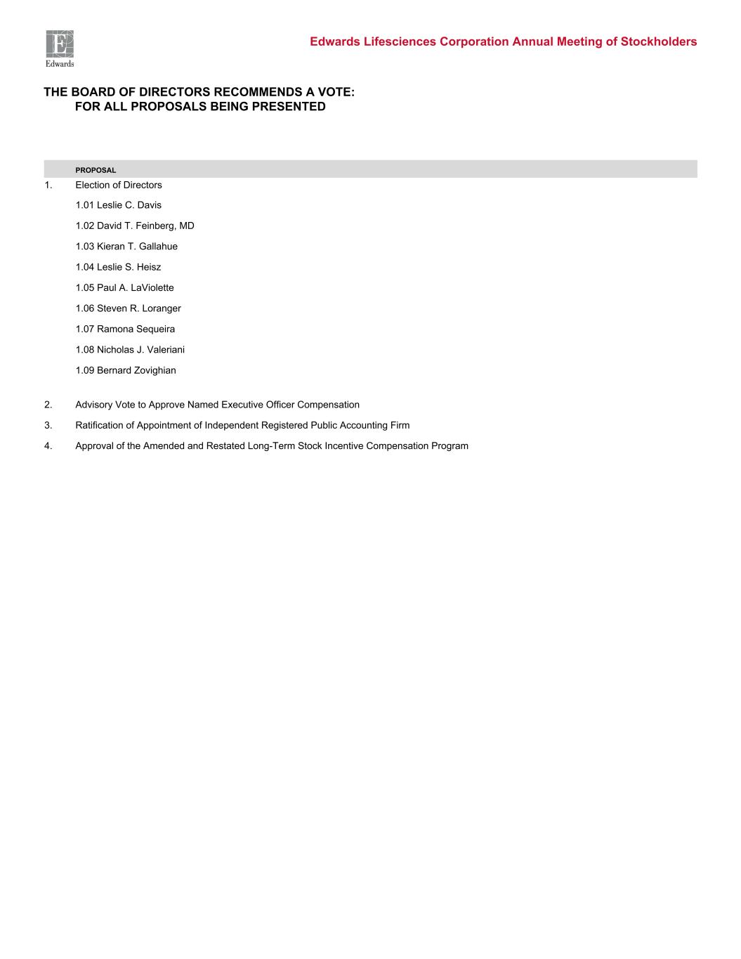PROPOSAL 1. Election of Directors 1.01 Leslie C. Davis 1.02 David T. Feinberg, MD 1.03 Kieran T. Gallahue 1.04 Leslie S. Heisz 1.05 Paul A. LaViolette 1.06 Steven R. Loranger 1.07 Ramona Sequeira 1.08 Nicholas J. Valeriani 1.09 Bernard Zovighian 2. Advisory Vote to Approve Named Executive Officer Compensation 3. Ratification of Appointment of Independent Registered Public Accounting Firm 4. Approval of the Amended and Restated Long-Term Stock Incentive Compensation Program THE BOARD OF DIRECTORS RECOMMENDS A VOTE: FOR ALL PROPOSALS BEING PRESENTED Edwards Lifesciences Corporation Annual Meeting of Stockholders