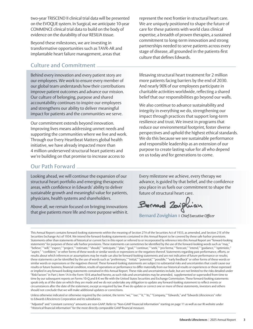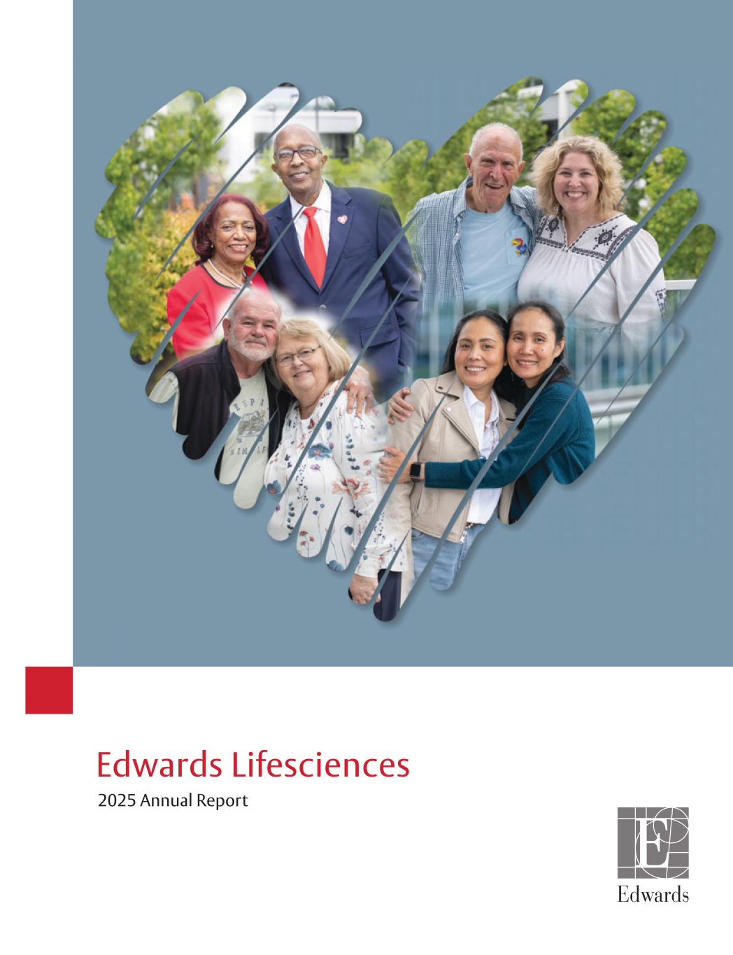 3 Edwards Lifesciences I 2025 Annual Report Our Path Forward Looking ahead, we will continue the expansion of our structural heart portfolio and emerging therapeutic areas, with confidence in Edwards’ ability to deliver sustainable growth and meaningful value for patients, physicians, health systems and shareholders. Above all, we remain focused on bringing innovations that give patients more life and more purpose within it. Every milestone we achieve, every therapy we advance, is guided by that belief, and the confidence you place in us fuels our commitment to shape the future of structural heart care. Bernard Zovighian I Chief Executive Officer Culture and Commitment Behind every innovation and every patient story are our employees. We work to ensure every member of our global team understands how their contributions improve patient outcomes and advance our mission. Our culture of belonging, purpose and shared accountability continues to inspire our employees and strengthens our ability to deliver meaningful impact for patients and the communities we serve. Our commitment extends beyond innovation. Improving lives means addressing unmet needs and supporting the communities where we live and work. Through our Every Heartbeat Matters global health initiative, we have already impacted more than 4 million underserved structural heart patients and we’re building on that promise to increase access to lifesaving structural heart treatment for 2 million more patients facing barriers by the end of 2030. And nearly 90% of our employees participate in charitable activities worldwide, reflecting a shared belief that our responsibilities go beyond our walls. We also continue to advance sustainability and integrity in everything we do, strengthening our impact through practices that support long-term resilience and trust. We invest in programs that reduce our environmental footprint, foster diverse perspectives and uphold the highest ethical standards. We do this because we see sustainable performance and responsible leadership as an extension of our purpose to create lasting value for all who depend on us today and for generations to come. two-year TRISCEND II clinical trial data will be presented on the EVOQUE system. In Surgical, we anticipate 10-year COMMENCE clinical trial data to build on the body of evidence on the durability of our RESILIA tissue. Beyond these milestones, we are investing in transformative opportunities such as TAVR-AR and implantable heart failure management, areas that represent the next frontier in structural heart care. We are uniquely positioned to shape the future of care for these patients with world class clinical expertise, a breadth of proven therapies, a sustained commitment to long-term innovation and strong partnerships needed to serve patients across every stage of disease, all grounded in the patients-first culture that defines Edwards. This Annual Report contains forward-looking statements within the meaning of Section 27A of the Securities Act of 1933, as amended, and Section 21E of the Securities Exchange Act of 1934. We intend the forward-looking statements contained in this Annual Report to be covered by these safe harbor provisions. Statements other than statements of historical or current fact in this report or referred to or incorporated by reference into this Annual Report are “forward-looking statements” for purposes of these safe harbor provisions. These statements can sometimes be identified by the use of the forward-looking words such as “may,” “believe,” “will,” “expect,” “project,” “estimate,” “should,” “anticipate,” “plan,” “goal,” “continue,” “seek,” “pro forma,” “forecast,” “intend,” “guidance,” “optimistic,” “aspire,” “confident,” or other forms of these words or similar words or expressions or the negatives thereof. Statements regarding past performance, efforts, or results about which inferences or assumptions may be made can also be forward-looking statements and are not indicative of future performance or results; these statements can be identified by the use of words such as “preliminary,” “initial,” “potential,” “possible,” “early feedback” or other forms of these words or similar words or expressions or the negatives thereof. These forward-looking statements are subject to substantial risks and uncertainties that could cause our results or future business, financial condition, results of operations or performance to differ materially from our historical results or experiences or those expressed or implied in any forward-looking statements contained in this Annual Report. These risks and uncertainties include, but are not limited to the risks detailed under “Risk Factors” in Part I, Item 1A in the Form 10-K attached hereto, as such risks and uncertainties may be amended, supplemented or superseded from time to time by our subsequent reports on Forms 10-Q and 8-K we file with the United States Securities and Exchange Commission. These forward-looking statements speak only as of the date on which they are made and we do not undertake any obligation to update any forward-looking statement to reflect events or circumstances after the date of the statement, except as required by law. If we do update or correct one or more of these statements, investors and others should not conclude that we will make additional updates or corrections. Unless otherwise indicated or otherwise required by the context, the terms “we,” “our,” “it,” “its,” “Company,” “Edwards,” and “Edwards Lifesciences” refer to Edwards Lifesciences Corporation and its subsidiaries. “Adjusted” and “constant currency” amounts are non-GAAP. Refer to “Non-GAAP Financial Information” starting on page 11 as well as our IR website under “Historical financial information” for the most directly comparable GAAP financial measure.
