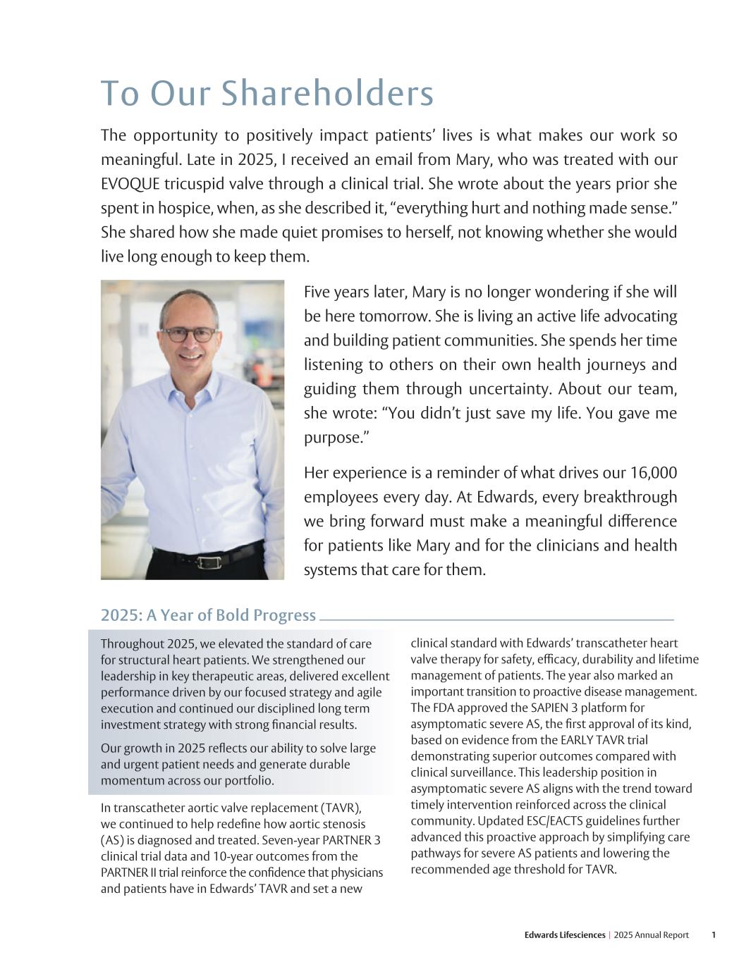 1 Edwards Lifesciences I 2025 Annual Report To Our Shareholders The opportunity to positively impact patients’ lives is what makes our work so meaningful. Late in 2025, I received an email from Mary, who was treated with our EVOQUE tricuspid valve through a clinical trial. She wrote about the years prior she spent in hospice, when, as she described it, “everything hurt and nothing made sense.” She shared how she made quiet promises to herself, not knowing whether she would live long enough to keep them. Five years later, Mary is no longer wondering if she will be here tomorrow. She is living an active life advocating and building patient communities. She spends her time listening to others on their own health journeys and guiding them through uncertainty. About our team, she wrote: “You didn’t just save my life. You gave me purpose.” Her experience is a reminder of what drives our 16,000 employees every day. At Edwards, every breakthrough we bring forward must make a meaningful difference for patients like Mary and for the clinicians and health systems that care for them. 2025: A Year of Bold Progress Throughout 2025, we elevated the standard of care for structural heart patients. We strengthened our leadership in key therapeutic areas, delivered excellent performance driven by our focused strategy and agile execution and continued our disciplined long term investment strategy with strong financial results. Our growth in 2025 reflects our ability to solve large and urgent patient needs and generate durable momentum across our portfolio. In transcatheter aortic valve replacement (TAVR), we continued to help redefine how aortic stenosis (AS) is diagnosed and treated. Seven-year PARTNER 3 clinical trial data and 10-year outcomes from the PARTNER II trial reinforce the confidence that physicians and patients have in Edwards’ TAVR and set a new clinical standard with Edwards’ transcatheter heart valve therapy for safety, efficacy, durability and lifetime management of patients. The year also marked an important transition to proactive disease management. The FDA approved the SAPIEN 3 platform for asymptomatic severe AS, the first approval of its kind, based on evidence from the EARLY TAVR trial demonstrating superior outcomes compared with clinical surveillance. This leadership position in asymptomatic severe AS aligns with the trend toward timely intervention reinforced across the clinical community. Updated ESC/EACTS guidelines further advanced this proactive approach by simplifying care pathways for severe AS patients and lowering the recommended age threshold for TAVR.