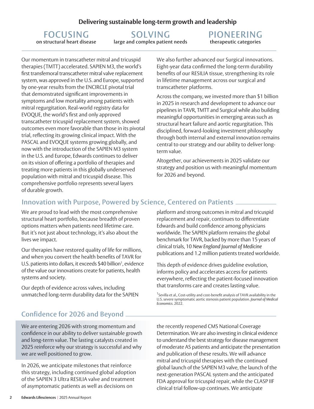 2 Edwards Lifesciences I 2025 Annual Report Our momentum in transcatheter mitral and tricuspid therapies (TMTT) accelerated. SAPIEN M3, the world’s first transfemoral transcatheter mitral valve replacement system, was approved in the U.S. and Europe, supported by one-year results from the ENCIRCLE pivotal trial that demonstrated significant improvements in symptoms and low mortality among patients with mitral regurgitation. Real-world registry data for EVOQUE, the world’s first and only approved transcatheter tricuspid replacement system, showed outcomes even more favorable than those in its pivotal trial, reflecting its growing clinical impact. With the PASCAL and EVOQUE systems growing globally, and now with the introduction of the SAPIEN M3 system in the U.S. and Europe, Edwards continues to deliver on its vision of offering a portfolio of therapies and treating more patients in this globally underserved population with mitral and tricuspid disease. This comprehensive portfolio represents several layers of durable growth. We also further advanced our Surgical innovations. Eight-year data confirmed the long-term durability benefits of our RESILIA tissue, strengthening its role in lifetime management across our surgical and transcatheter platforms. Across the company, we invested more than $1 billion in 2025 in research and development to advance our pipelines in TAVR, TMTT and Surgical while also building meaningful opportunities in emerging areas such as structural heart failure and aortic regurgitation. This disciplined, forward-looking investment philosophy through both internal and external innovation remains central to our strategy and our ability to deliver long- term value. Altogether, our achievements in 2025 validate our strategy and position us with meaningful momentum for 2026 and beyond. We are proud to lead with the most comprehensive structural heart portfolio, because breadth of proven options matters when patients need lifetime care. But it’s not just about technology, it’s also about the lives we impact. Our therapies have restored quality of life for millions, and when you convert the health benefits of TAVR for U.S. patients into dollars, it exceeds $40 billion1, evidence of the value our innovations create for patients, health systems and society. Our depth of evidence across valves, including unmatched long-term durability data for the SAPIEN Confidence for 2026 and Beyond We are entering 2026 with strong momentum and confidence in our ability to deliver sustainable growth and long-term value. The lasting catalysts created in 2025 reinforce why our strategy is successful and why we are well positioned to grow. In 2026, we anticipate milestones that reinforce this strategy, including continued global adoption of the SAPIEN 3 Ultra RESILIA valve and treatment of asymptomatic patients as well as decisions on the recently reopened CMS National Coverage Determination. We are also investing in clinical evidence to understand the best strategy for disease management of moderate AS patients and anticipate the presentation and publication of these results. We will advance mitral and tricuspid therapies with the continued global launch of the SAPIEN M3 valve, the launch of the next-generation PASCAL system and the anticipated FDA approval for tricuspid repair, while the CLASP IIF clinical trial follow-up continues. We anticipate Innovation with Purpose, Powered by Science, Centered on Patients platform and strong outcomes in mitral and tricuspid replacement and repair, continues to differentiate Edwards and build confidence among physicians worldwide. The SAPIEN platform remains the global benchmark for TAVR, backed by more than 15 years of clinical trials, 10 New England Journal of Medicine publications and 1.2 million patients treated worldwide. This depth of evidence drives guideline evolution, informs policy and accelerates access for patients everywhere, reflecting the patient-focused innovation that transforms care and creates lasting value. 1Sevilla et al., Cost-utility and cost-benefit analysis of TAVR availability in the U.S. severe symptomatic aortic stenosis patient population. Journal of Medical Economics. 2022. SOLVING large and complex patient needs FOCUSING on structural heart disease PIONEERING therapeutic categories Delivering sustainable long-term growth and leadership
