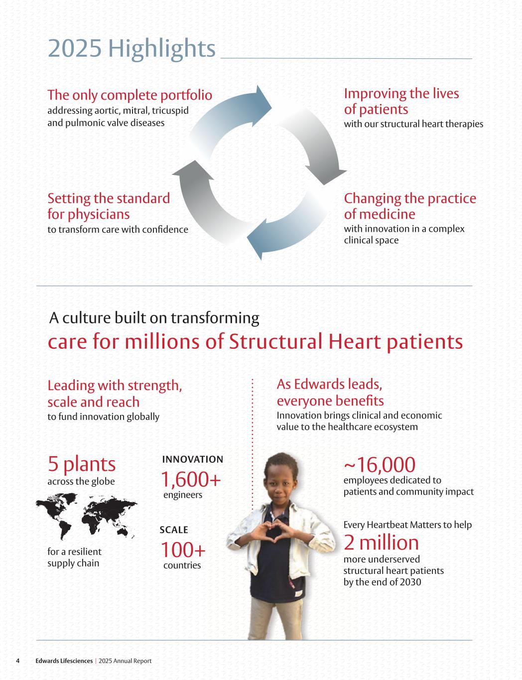 4 Edwards Lifesciences I 2025 Annual Report A culture built on transforming care for millions of Structural Heart patients As Edwards leads, everyone benefits Innovation brings clinical and economic value to the healthcare ecosystem ~16,000 ployees dedicated to ents and community impact INNOVATIO 1,600+ engineers SCALE 100+ countries 5 plants across the globe for a resilient supply chain ry Heartbeat Matters to help 2 million re underserved uctural heart patients he end of 2030 Leading with strength, scale and reach to fund innovation globally em pati N Eve mo str by t 2025 Highlights The only complete portfolio addressing aortic, mitral, tricuspid and pulmonic valve diseases Setting the standard for physicians to transform care with confidence Improving the lives of patients with our structural heart therapies Changing the practice of medicine with innovation in a complex clinical space