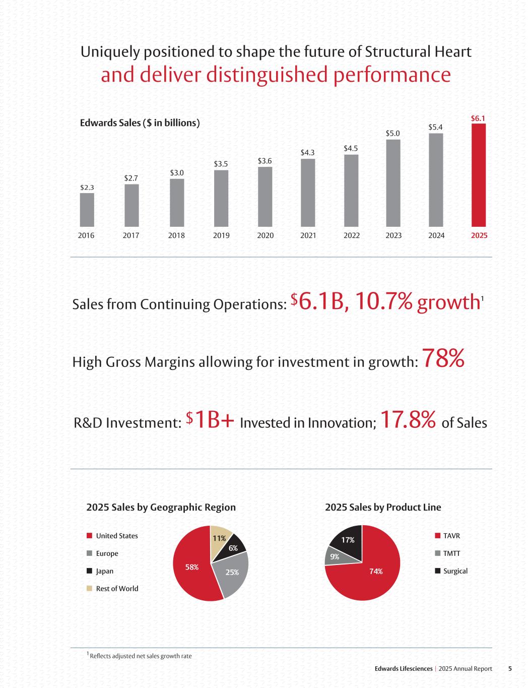5 Edwards Lifesciences I 2025 Annual Report $2.3 $2.7 $3.0 $3.5 $3.6 2016 2017 2018 2019 2020 $4.3 2021 $4.5 2022 $5.0 2023 $6.1 2025 $5.4 2024 Edwards Sales ($ in billions) 2025 Sales by Geographic Region 2025 Sales by Product Line United States Europe Japan Rest of World TAVR TMTT Surgical58% 11% 25% 6% 74% 17% 9% R&D Investment: $1B+ Invested in Innovation; 17.8% of Sales Sales from Continuing Operations: $6.1B, 10.7% growth1 Uniquely positioned to shape the future of Structural Heart and deliver distinguished performance High Gross Margins allowing for investment in growth: 78% 1 Reflects adjusted net sales growth rate