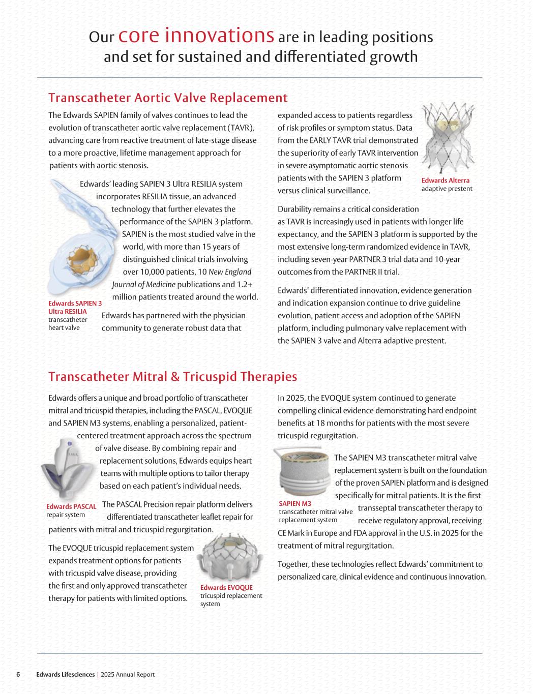6 Edwards Lifesciences I 2025 Annual Report The Edwards SAPIEN family of valves continues to lead the evolution of transcatheter aortic valve replacement (TAVR), advancing care from reactive treatment of late-stage disease to a more proactive, lifetime management approach for patients with aortic stenosis. ding SAPIEN 3 Ultra RESILIA systemdwards’ leaE ates RESILIA tissue, an advancedorincorp hnology that further elevates thetec performance of the SAPIEN 3 platform. SAPIEN is the most studied valve in the world, with more than 15 years of distinguished clinical trials involving over 10,000 patients, 10 New England rnal of MedicineJou publications and 1.2+ million patients treated around the world. Edwards has partnered with the physician community to generate robust data that expanded access to patients regardless of risk profiles or symptom status. Data from the EARLY TAVR trial demonstrated the superiority of early TAVR intervention in severe asymptomatic aortic stenosis patients with the SAPIEN 3 platform versus clinical surveillance. Durability remains a critical consideration as TAVR is increasingly used in patients with longer life expectancy, and the SAPIEN 3 platform is supported by the most extensive long-term randomized evidence in TAVR, including seven-year PARTNER 3 trial data and 10-year outcomes from the PARTNER II trial. Edwards’ differentiated innovation, evidence generation and indication expansion continue to drive guideline evolution, patient access and adoption of the SAPIEN platform, including pulmonary valve replacement with the SAPIEN 3 valve and Alterra adaptive prestent. Transcatheter Aortic Valve Replacement Our core innovations are in leading positions and set for sustained and differentiated growth Edwards offers a unique and broad portfolio of transcatheter mitral and tricuspid therapies, including the PASCAL, EVOQUE and SAPIEN M3 systems, enabling a personalized, patient- centered treatment approach across the spectrum of valve disease. By combining repair and replacement solutions, Edwards equips heart teams with multiple options to tailor therapy based on each patient’s individual needs. The PASCAL Precision repair platform delivers differentiated transcatheter leaflet repair for patients with mitral and tricuspid regurgitation. The EVOQUE tricuspid replacement system expands treatment options for patients with tricuspid valve disease, providing the first and only approved transcatheter therapy for patients with limited options. Transcatheter Mitral & Tricuspid Therapies In 2025, the EVOQUE system continued to generate compelling clinical evidence demonstrating hard endpoint benefits at 18 months for patients with the most severe tricuspid regurgitation. The SAPIEN M3 transcatheter mitral valve eplacement system is built on the foundation r of the proven SAPIEN platform and is designed specifically for mitral patients. It is the first transseptal transcatheter therapy to receive regulatory approval, receiving CE Mark in Europe and FDA approval in the U.S. in 2025 for the treatment of mitral regurgitation. Together, these technologies reflect Edwards’ commitment to personalized care, clinical evidence and continuous innovation.