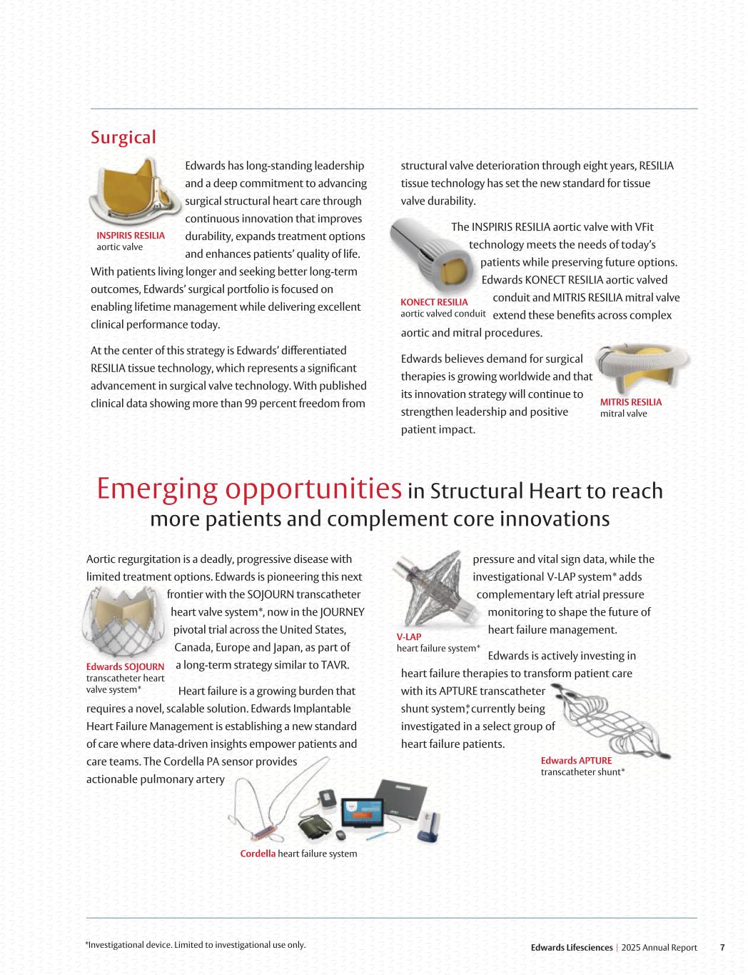 *Investigational device. Limited to investigational use only. Z 7 Edwards Lifesciences I 2025 Annual Report Aortic regurgitation is a deadly, progressive disease with limited treatment options. Edwards is pioneering this next ontier with the SOJOURN transcatheter rf heart valve system*, now in the JOURNEY pivotal trial across the United States, Canada, Europe and Japan, as part of a long-term strategy similar to TAVR. Heart failure is a growing burden that requires a novel, scalable solution. Edwards Implantable Heart Failure Management is establishing a new standard of care where data-driven insights empower patients and care teams. The Cordella PA sensor provides actionable pulmonary artery essure and vital sign data, while thepr estigationalinv V-LAP system* adds omplementary left atrial pressurec monitoring to shape the future of heart failure management. Edwards is actively investing in orm patient careheart failure therapies to transf with its APTURE transcatheter shunt system*, currently being investigated in a select group of heart failure patients. wards has long-standing leadershipEd d a deep commitment to advancingan gical structural heart care throughsur tinuous innovation that improvescon durability, expands treatment options and enhances patients’ quality of life. With patients living longer and seeking better long-term outcomes, Edwards’ surgical portfolio is focused on enabling lifetime management while delivering excellent clinical performance today. At the center of this strategy is Edwards’ differentiated RESILIA tissue technology, which represents a significant advancement in surgical valve technology. With published clinical data showing more than 99 percent freedom from Surgical structural valve deterioration through eight years, RESILIA tissue technology has set the new standard for tissue valve durability. NSPIRIS RESILIA aortic valve with VFitIThe chnology meets the needs of today’set patients while preserving future options. Edwards KONECT RESILIA aortic valved conduit and MITRIS RESILIA mitral valve extend these benefits across complex aortic and mitral procedures. Edwards believes demand for surgical therapies is growing worldwide and that its innovation strategy will continue to strengthen leadership and positive patient impact. Cordella heart failure system Emerging opportunities in Structural Heart to reach more patients and complement core innovations