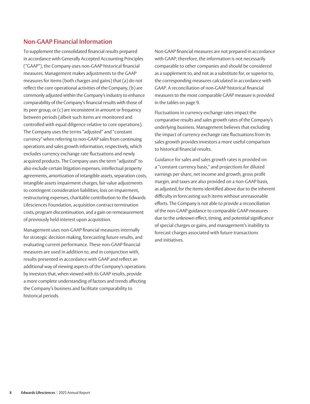 8 Edwards Lifesciences I 2025 Annual Report To supplement the consolidated financial results prepared in accordance with Generally Accepted Accounting Principles (“GAAP”), the Company uses non-GAAP historical financial measures. Management makes adjustments to the GAAP measures for items (both charges and gains) that (a) do not reflect the core operational activities of the Company, (b) are commonly adjusted within the Company’s industry to enhance comparability of the Company’s financial results with those of its peer group, or (c) are inconsistent in amount or frequency between periods (albeit such items are monitored and controlled with equal diligence relative to core operations). The Company uses the terms “adjusted” and “constant currency” when referring to non-GAAP sales from continuing operations and sales growth information, respectively, which excludes currency exchange rate fluctuations and newly acquired products. The Company uses the term “adjusted” to also exclude certain litigation expenses, intellectual property agreements, amortization of intangible assets, separation costs, intangible assets impairment charges, fair value adjustments to contingent consideration liabilities, loss on impairment, restructuring expenses, charitable contribution to the Edwards Lifesciences Foundation, acquisition contract termination costs, program discontinuation, and a gain on remeasurement of previously held interest upon acquisition. Management uses non-GAAP financial measures internally for strategic decision making, forecasting future results, and evaluating current performance. These non-GAAP financial measures are used in addition to, and in conjunction with, results presented in accordance with GAAP and reflect an additional way of viewing aspects of the Company’s operations by investors that, when viewed with its GAAP results, provide a more complete understanding of factors and trends affecting the Company’s business and facilitate comparability to historical periods. Non-GAAP Financial Information Non-GAAP financial measures are not prepared in accordance with GAAP; therefore, the information is not necessarily comparable to other companies and should be considered as a supplement to, and not as a substitute for, or superior to, the corresponding measures calculated in accordance with GAAP. A reconciliation of non-GAAP historical financial measures to the most comparable GAAP measure is provided in the tables on page 9. Fluctuations in currency exchange rates impact the comparative results and sales growth rates of the Company’s underlying business. Management believes that excluding the impact of currency exchange rate fluctuations from its sales growth provides investors a more useful comparison to historical financial results. Guidance for sales and sales growth rates is provided on a “constant currency basis,” and projections for diluted earnings per share, net income and growth, gross profit margin, and taxes are also provided on a non-GAAP basis, as adjusted, for the items identified above due to the inherent difficulty in forecasting such items without unreasonable efforts. The Company is not able to provide a reconciliation of the non-GAAP guidance to comparable GAAP measures due to the unknown effect, timing, and potential significance of special charges or gains, and management’s inability to forecast charges associated with future transactions and initiatives.