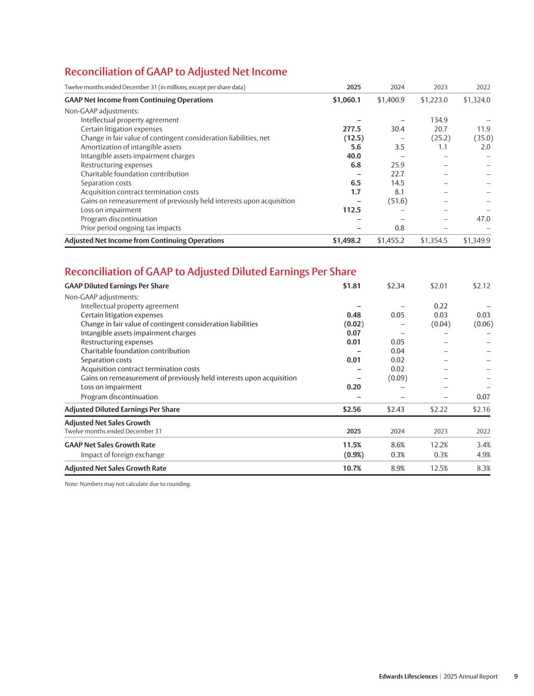 9 Edwards Lifesciences I 2025 Annual Report Reconciliation of GAAP to Adjusted Net Income Twelve months ended December 31 (in millions, except per share data) 2025 2024 2023 2022 GAAP Net Income from Continuing Operations $1,060.1 $1,400.9 $1,223.0 $1,324.0 Non-GAAP adjustments: Intellectual property agreement – – 134.9 – Certain litigation expenses 277.5 30.4 20.7 11.9 Change in fair value of contingent consideration liabilities, net (12.5) – (25.2) (35.0) Amortization of intangible assets 5.6 3.5 1.1 2.0 Intangible assets impairment charges 40.0 – – – Restructuring expenses 6.8 25.9 – – Charitable foundation contribution – 22.7 – – Separation costs 6.5 14.5 – – Acquisition contract termination costs 1.7 8.1 – – Gains on remeasurement of previously held interests upon acquisition – (51.6) – – Loss on impairment 112.5 – – – Program discontinuation – – – 47.0 Prior period ongoing tax impacts – 0.8 – – Adjusted Net Income from Continuing Operations $1,498.2 $1,455.2 $1,354.5 $1,349.9 Reconciliation of GAAP to Adjusted Diluted Earnings Per Share GAAP Diluted Earnings Per Share $1.81 $2.34 $2.01 $2.12 Non-GAAP adjustments: Intellectual property agreement – – 0.22 – Certain litigation expenses 0.48 0.05 0.03 0.03 Change in fair value of contingent consideration liabilities (0.02) – (0.04) (0.06) Intangible assets impairment charges 0.07 – – – Restructuring expenses 0.01 0.05 – – Charitable foundation contribution – 0.04 – – Separation costs 0.01 0.02 – – Acquisition contract termination costs – 0.02 – – Gains on remeasurement of previously held interests upon acquisition – (0.09) – – Loss on impairment 0.20 – – – Program discontinuation – – – 0.07 Adjusted Diluted Earnings Per Share $2.56 $2.43 $2.22 $2.16 Adjusted Net Sales Growth Twelve months ended December 31 2025 2024 2023 2022 GAAP Net Sales Growth Rate 11.5% 8.6% 12.2% 3.4% Impact of foreign exchange (0.9%) 0.3% 0.3% 4.9% Adjusted Net Sales Growth Rate 10.7% 8.9% 12.5% 8.3% Note: Numbers may not calculate due to rounding.