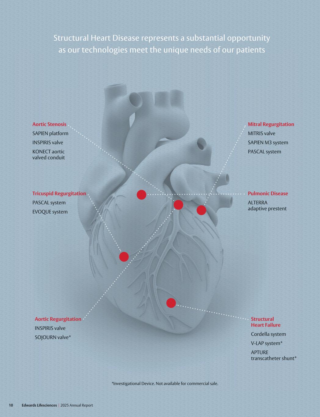 10 Edwards Lifesciences I 2025 Annual Report *Investigational Device. Not available for commercial sale. • ••• Aortic Regurgitation INSPIRIS valve SOJOURN valve* Tricuspid Regurgitation PASCAL system EVOQUE system Aortic Stenosis SAPIEN platform INSPIRIS valve KONECT aortic valved conduit • Structural Heart Failure Cordella system V-LAP system* APTURE transcatheter shunt* Pulmonic Disease ALTERRA adaptive prestent Mitral Regurgitation MITRIS valve SAPIEN M3 system PASCAL system Structural Heart Disease represents a substantial opportunity as our technologies meet the unique needs of our patients