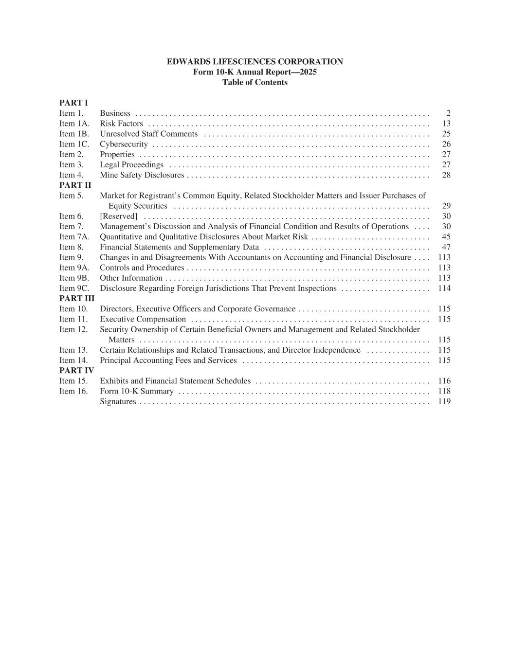 EDWARDS LIFESCIENCES CORPORATION Form 10-K Annual Report—2025 Table of Contents PART I Item 1. Business . . . . . . . . . . . . . . . . . . . . . . . . . . . . . . . . . . . . . . . . . . . . . . . . . . . . . . . . . . . . . . . . . . . . . 2 Item 1A. Risk Factors . . . . . . . . . . . . . . . . . . . . . . . . . . . . . . . . . . . . . . . . . . . . . . . . . . . . . . . . . . . . . . . . . . 13 Item 1B. Unresolved Staff Comments . . . . . . . . . . . . . . . . . . . . . . . . . . . . . . . . . . . . . . . . . . . . . . . . . . . . . 25 Item 1C. Cybersecurity . . . . . . . . . . . . . . . . . . . . . . . . . . . . . . . . . . . . . . . . . . . . . . . . . . . . . . . . . . . . . . . . . 26 Item 2. Properties . . . . . . . . . . . . . . . . . . . . . . . . . . . . . . . . . . . . . . . . . . . . . . . . . . . . . . . . . . . . . . . . . . . . 27 Item 3. Legal Proceedings . . . . . . . . . . . . . . . . . . . . . . . . . . . . . . . . . . . . . . . . . . . . . . . . . . . . . . . . . . . . . 27 Item 4. Mine Safety Disclosures . . . . . . . . . . . . . . . . . . . . . . . . . . . . . . . . . . . . . . . . . . . . . . . . . . . . . . . . . 28 PART II Item 5. Market for Registrant’s Common Equity, Related Stockholder Matters and Issuer Purchases of Equity Securities . . . . . . . . . . . . . . . . . . . . . . . . . . . . . . . . . . . . . . . . . . . . . . . . . . . . . . . . . . . . 29 Item 6. [Reserved] . . . . . . . . . . . . . . . . . . . . . . . . . . . . . . . . . . . . . . . . . . . . . . . . . . . . . . . . . . . . . . . . . . . 30 Item 7. Management’s Discussion and Analysis of Financial Condition and Results of Operations . . . . 30 Item 7A. Quantitative and Qualitative Disclosures About Market Risk . . . . . . . . . . . . . . . . . . . . . . . . . . . . 45 Item 8. Financial Statements and Supplementary Data . . . . . . . . . . . . . . . . . . . . . . . . . . . . . . . . . . . . . . . 47 Item 9. Changes in and Disagreements With Accountants on Accounting and Financial Disclosure . . . . 113 Item 9A. Controls and Procedures . . . . . . . . . . . . . . . . . . . . . . . . . . . . . . . . . . . . . . . . . . . . . . . . . . . . . . . . . 113 Item 9B. Other Information . . . . . . . . . . . . . . . . . . . . . . . . . . . . . . . . . . . . . . . . . . . . . . . . . . . . . . . . . . . . . . 113 Item 9C. Disclosure Regarding Foreign Jurisdictions That Prevent Inspections . . . . . . . . . . . . . . . . . . . . . 114 PART III Item 10. Directors, Executive Officers and Corporate Governance . . . . . . . . . . . . . . . . . . . . . . . . . . . . . . . 115 Item 11. Executive Compensation . . . . . . . . . . . . . . . . . . . . . . . . . . . . . . . . . . . . . . . . . . . . . . . . . . . . . . . . 115 Item 12. Security Ownership of Certain Beneficial Owners and Management and Related Stockholder Matters . . . . . . . . . . . . . . . . . . . . . . . . . . . . . . . . . . . . . . . . . . . . . . . . . . . . . . . . . . . . . . . . . . . . 115 Item 13. Certain Relationships and Related Transactions, and Director Independence . . . . . . . . . . . . . . . 115 Item 14. Principal Accounting Fees and Services . . . . . . . . . . . . . . . . . . . . . . . . . . . . . . . . . . . . . . . . . . . . 115 PART IV Item 15. Exhibits and Financial Statement Schedules . . . . . . . . . . . . . . . . . . . . . . . . . . . . . . . . . . . . . . . . . 116 Item 16. Form 10-K Summary . . . . . . . . . . . . . . . . . . . . . . . . . . . . . . . . . . . . . . . . . . . . . . . . . . . . . . . . . . . 118 Signatures . . . . . . . . . . . . . . . . . . . . . . . . . . . . . . . . . . . . . . . . . . . . . . . . . . . . . . . . . . . . . . . . . . . . 119