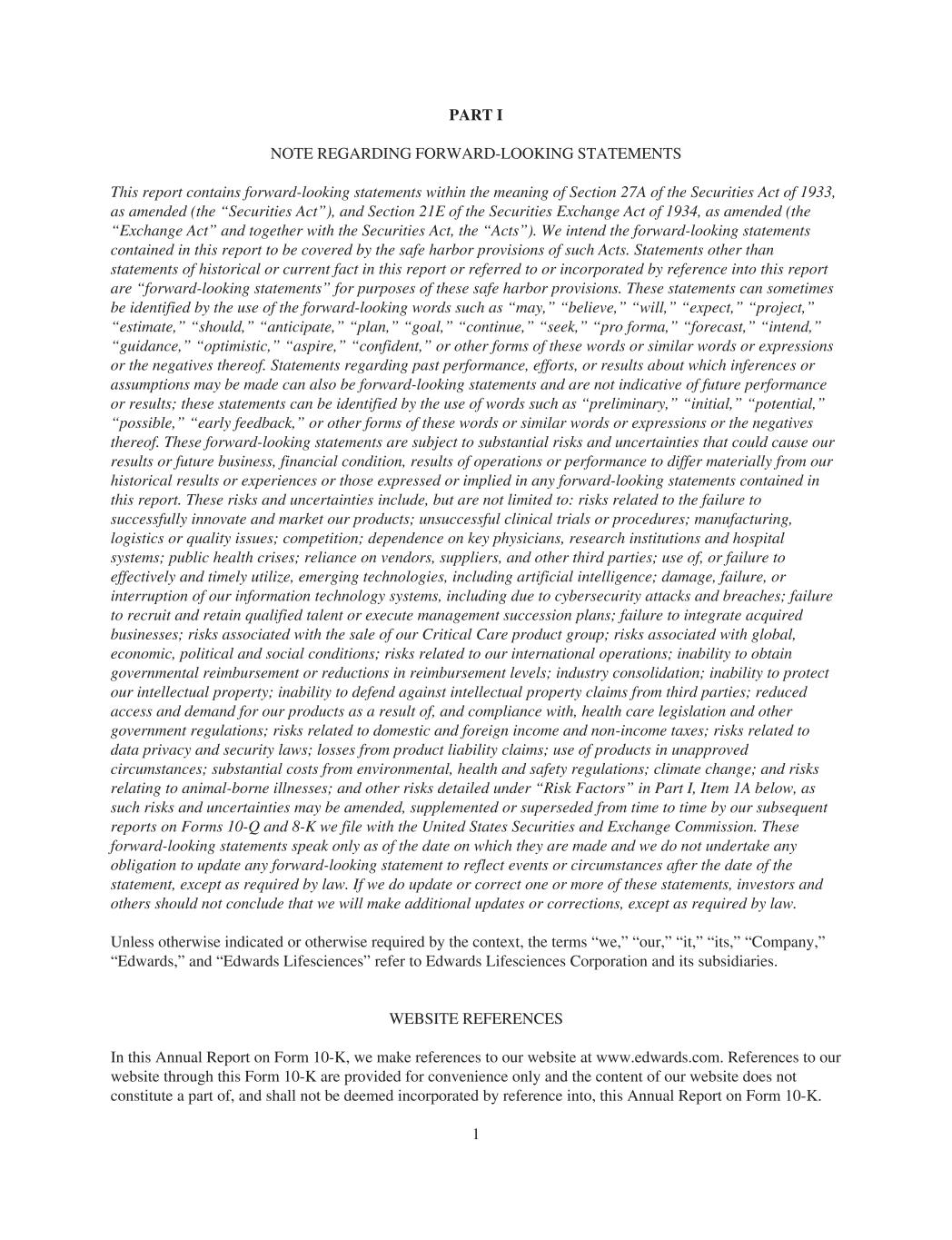PART I NOTE REGARDING FORWARD-LOOKING STATEMENTS This report contains forward-looking statements within the meaning of Section 27A of the Securities Act of 1933, as amended (the “Securities Act”), and Section 21E of the Securities Exchange Act of 1934, as amended (the “Exchange Act” and together with the Securities Act, the “Acts”). We intend the forward-looking statements contained in this report to be covered by the safe harbor provisions of such Acts. Statements other than statements of historical or current fact in this report or referred to or incorporated by reference into this report are “forward-looking statements” for purposes of these safe harbor provisions. These statements can sometimes be identified by the use of the forward-looking words such as “may,” “believe,” “will,” “expect,” “project,” “estimate,” “should,” “anticipate,” “plan,” “goal,” “continue,” “seek,” “pro forma,” “forecast,” “intend,” “guidance,” “optimistic,” “aspire,” “confident,” or other forms of these words or similar words or expressions or the negatives thereof. Statements regarding past performance, efforts, or results about which inferences or assumptions may be made can also be forward-looking statements and are not indicative of future performance or results; these statements can be identified by the use of words such as “preliminary,” “initial,” “potential,” “possible,” “early feedback,” or other forms of these words or similar words or expressions or the negatives thereof. These forward-looking statements are subject to substantial risks and uncertainties that could cause our results or future business, financial condition, results of operations or performance to differ materially from our historical results or experiences or those expressed or implied in any forward-looking statements contained in this report. These risks and uncertainties include, but are not limited to: risks related to the failure to successfully innovate and market our products; unsuccessful clinical trials or procedures; manufacturing, logistics or quality issues; competition; dependence on key physicians, research institutions and hospital systems; public health crises; reliance on vendors, suppliers, and other third parties; use of, or failure to effectively and timely utilize, emerging technologies, including artificial intelligence; damage, failure, or interruption of our information technology systems, including due to cybersecurity attacks and breaches; failure to recruit and retain qualified talent or execute management succession plans; failure to integrate acquired businesses; risks associated with the sale of our Critical Care product group; risks associated with global, economic, political and social conditions; risks related to our international operations; inability to obtain governmental reimbursement or reductions in reimbursement levels; industry consolidation; inability to protect our intellectual property; inability to defend against intellectual property claims from third parties; reduced access and demand for our products as a result of, and compliance with, health care legislation and other government regulations; risks related to domestic and foreign income and non-income taxes; risks related to data privacy and security laws; losses from product liability claims; use of products in unapproved circumstances; substantial costs from environmental, health and safety regulations; climate change; and risks relating to animal-borne illnesses; and other risks detailed under “Risk Factors” in Part I, Item 1A below, as such risks and uncertainties may be amended, supplemented or superseded from time to time by our subsequent reports on Forms 10-Q and 8-K we file with the United States Securities and Exchange Commission. These forward-looking statements speak only as of the date on which they are made and we do not undertake any obligation to update any forward-looking statement to reflect events or circumstances after the date of the statement, except as required by law. If we do update or correct one or more of these statements, investors and others should not conclude that we will make additional updates or corrections, except as required by law. Unless otherwise indicated or otherwise required by the context, the terms “we,” “our,” “it,” “its,” “Company,” “Edwards,” and “Edwards Lifesciences” refer to Edwards Lifesciences Corporation and its subsidiaries. WEBSITE REFERENCES In this Annual Report on Form 10-K, we make references to our website at www.edwards.com. References to our website through this Form 10-K are provided for convenience only and the content of our website does not constitute a part of, and shall not be deemed incorporated by reference into, this Annual Report on Form 10-K. 1