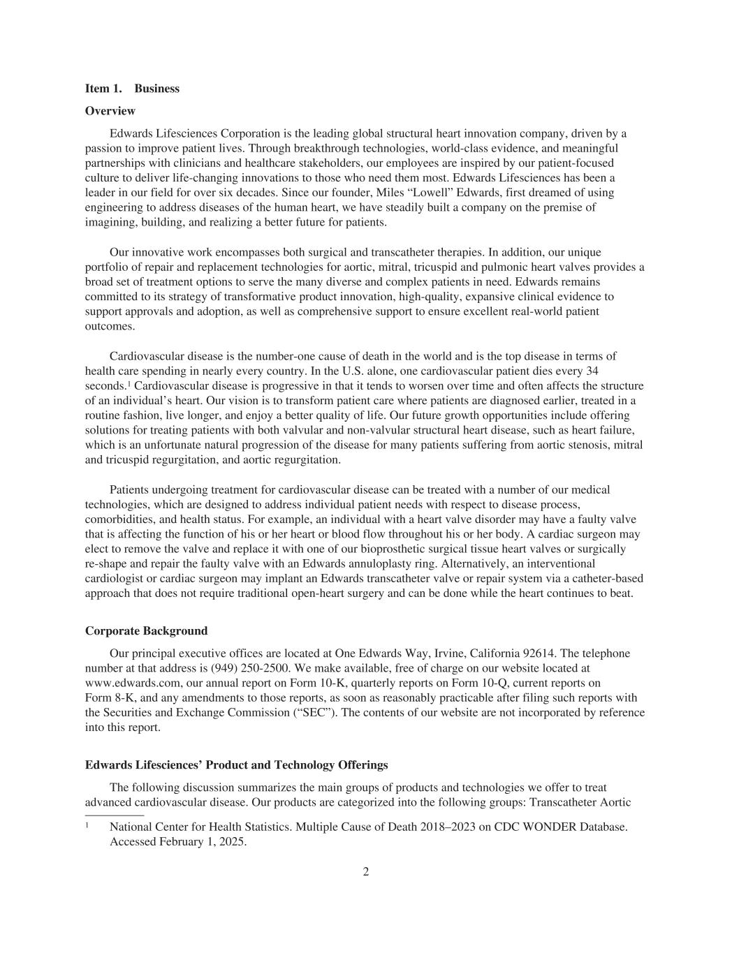 Item 1. Business Overview Edwards Lifesciences Corporation is the leading global structural heart innovation company, driven by a passion to improve patient lives. Through breakthrough technologies, world-class evidence, and meaningful partnerships with clinicians and healthcare stakeholders, our employees are inspired by our patient-focused culture to deliver life-changing innovations to those who need them most. Edwards Lifesciences has been a leader in our field for over six decades. Since our founder, Miles “Lowell” Edwards, first dreamed of using engineering to address diseases of the human heart, we have steadily built a company on the premise of imagining, building, and realizing a better future for patients. Our innovative work encompasses both surgical and transcatheter therapies. In addition, our unique portfolio of repair and replacement technologies for aortic, mitral, tricuspid and pulmonic heart valves provides a broad set of treatment options to serve the many diverse and complex patients in need. Edwards remains committed to its strategy of transformative product innovation, high-quality, expansive clinical evidence to support approvals and adoption, as well as comprehensive support to ensure excellent real-world patient outcomes. Cardiovascular disease is the number-one cause of death in the world and is the top disease in terms of health care spending in nearly every country. In the U.S. alone, one cardiovascular patient dies every 34 seconds.1 Cardiovascular disease is progressive in that it tends to worsen over time and often affects the structure of an individual’s heart. Our vision is to transform patient care where patients are diagnosed earlier, treated in a routine fashion, live longer, and enjoy a better quality of life. Our future growth opportunities include offering solutions for treating patients with both valvular and non-valvular structural heart disease, such as heart failure, which is an unfortunate natural progression of the disease for many patients suffering from aortic stenosis, mitral and tricuspid regurgitation, and aortic regurgitation. Patients undergoing treatment for cardiovascular disease can be treated with a number of our medical technologies, which are designed to address individual patient needs with respect to disease process, comorbidities, and health status. For example, an individual with a heart valve disorder may have a faulty valve that is affecting the function of his or her heart or blood flow throughout his or her body. A cardiac surgeon may elect to remove the valve and replace it with one of our bioprosthetic surgical tissue heart valves or surgically re-shape and repair the faulty valve with an Edwards annuloplasty ring. Alternatively, an interventional cardiologist or cardiac surgeon may implant an Edwards transcatheter valve or repair system via a catheter-based approach that does not require traditional open-heart surgery and can be done while the heart continues to beat. Corporate Background Our principal executive offices are located at One Edwards Way, Irvine, California 92614. The telephone number at that address is (949) 250-2500. We make available, free of charge on our website located at www.edwards.com, our annual report on Form 10-K, quarterly reports on Form 10-Q, current reports on Form 8-K, and any amendments to those reports, as soon as reasonably practicable after filing such reports with the Securities and Exchange Commission (“SEC”). The contents of our website are not incorporated by reference into this report. Edwards Lifesciences’ Product and Technology Offerings The following discussion summarizes the main groups of products and technologies we offer to treat advanced cardiovascular disease. Our products are categorized into the following groups: Transcatheter Aortic 1 National Center for Health Statistics. Multiple Cause of Death 2018–2023 on CDC WONDER Database. Accessed February 1, 2025. 2