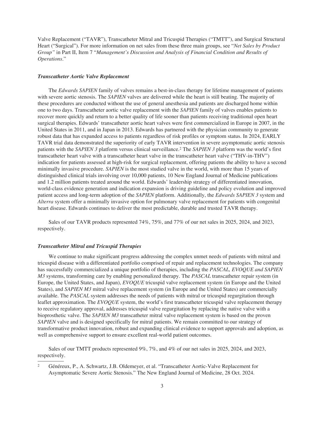 Valve Replacement (“TAVR”), Transcatheter Mitral and Tricuspid Therapies (“TMTT”), and Surgical Structural Heart (“Surgical”). For more information on net sales from these three main groups, see “Net Sales by Product Group” in Part II, Item 7 “Management’s Discussion and Analysis of Financial Condition and Results of Operations.” Transcatheter Aortic Valve Replacement The Edwards SAPIEN family of valves remains a best-in-class therapy for lifetime management of patients with severe aortic stenosis. The SAPIEN valves are delivered while the heart is still beating. The majority of these procedures are conducted without the use of general anesthesia and patients are discharged home within one to two days. Transcatheter aortic valve replacement with the SAPIEN family of valves enables patients to recover more quickly and return to a better quality of life sooner than patients receiving traditional open heart surgical therapies. Edwards’ transcatheter aortic heart valves were first commercialized in Europe in 2007, in the United States in 2011, and in Japan in 2013. Edwards has partnered with the physician community to generate robust data that has expanded access to patients regardless of risk profiles or symptom status. In 2024, EARLY TAVR trial data demonstrated the superiority of early TAVR intervention in severe asymptomatic aortic stenosis patients with the SAPIEN 3 platform versus clinical surveillance.2 The SAPIEN 3 platform was the world’s first transcatheter heart valve with a transcatheter heart valve in the transcatheter heart valve (“THV-in-THV”) indication for patients assessed at high-risk for surgical replacement, offering patients the ability to have a second minimally invasive procedure. SAPIEN is the most studied valve in the world, with more than 15 years of distinguished clinical trials involving over 10,000 patients, 10 New England Journal of Medicine publications and 1.2 million patients treated around the world. Edwards’ leadership strategy of differentiated innovation, world-class evidence generation and indication expansion is driving guideline and policy evolution and improved patient access and long-term adoption of the SAPIEN platform. Additionally, the Edwards SAPIEN 3 system and Alterra system offer a minimally invasive option for pulmonary valve replacement for patients with congenital heart disease. Edwards continues to deliver the most predictable, durable and trusted TAVR therapy. Sales of our TAVR products represented 74%, 75%, and 77% of our net sales in 2025, 2024, and 2023, respectively. Transcatheter Mitral and Tricuspid Therapies We continue to make significant progress addressing the complex unmet needs of patients with mitral and tricuspid disease with a differentiated portfolio comprised of repair and replacement technologies. The company has successfully commercialized a unique portfolio of therapies, including the PASCAL, EVOQUE and SAPIEN M3 systems, transforming care by enabling personalized therapy. The PASCAL transcatheter repair system (in Europe, the United States, and Japan), EVOQUE tricuspid valve replacement system (in Europe and the United States), and SAPIEN M3 mitral valve replacement system (in Europe and the United States) are commercially available. The PASCAL system addresses the needs of patients with mitral or tricuspid regurgitation through leaflet approximation. The EVOQUE system, the world’s first transcatheter tricuspid valve replacement therapy to receive regulatory approval, addresses tricuspid valve regurgitation by replacing the native valve with a bioprosthetic valve. The SAPIEN M3 transcatheter mitral valve replacement system is based on the proven SAPIEN valve and is designed specifically for mitral patients. We remain committed to our strategy of transformative product innovation, robust and expanding clinical evidence to support approvals and adoption, as well as comprehensive support to ensure excellent real-world patient outcomes. Sales of our TMTT products represented 9%, 7%, and 4% of our net sales in 2025, 2024, and 2023, respectively. 2 Généreux, P., A. Schwartz, J.B. Oldemeyer, et al. “Transcatheter Aortic-Valve Replacement for Asymptomatic Severe Aortic Stenosis.” The New England Journal of Medicine, 28 Oct. 2024. 3