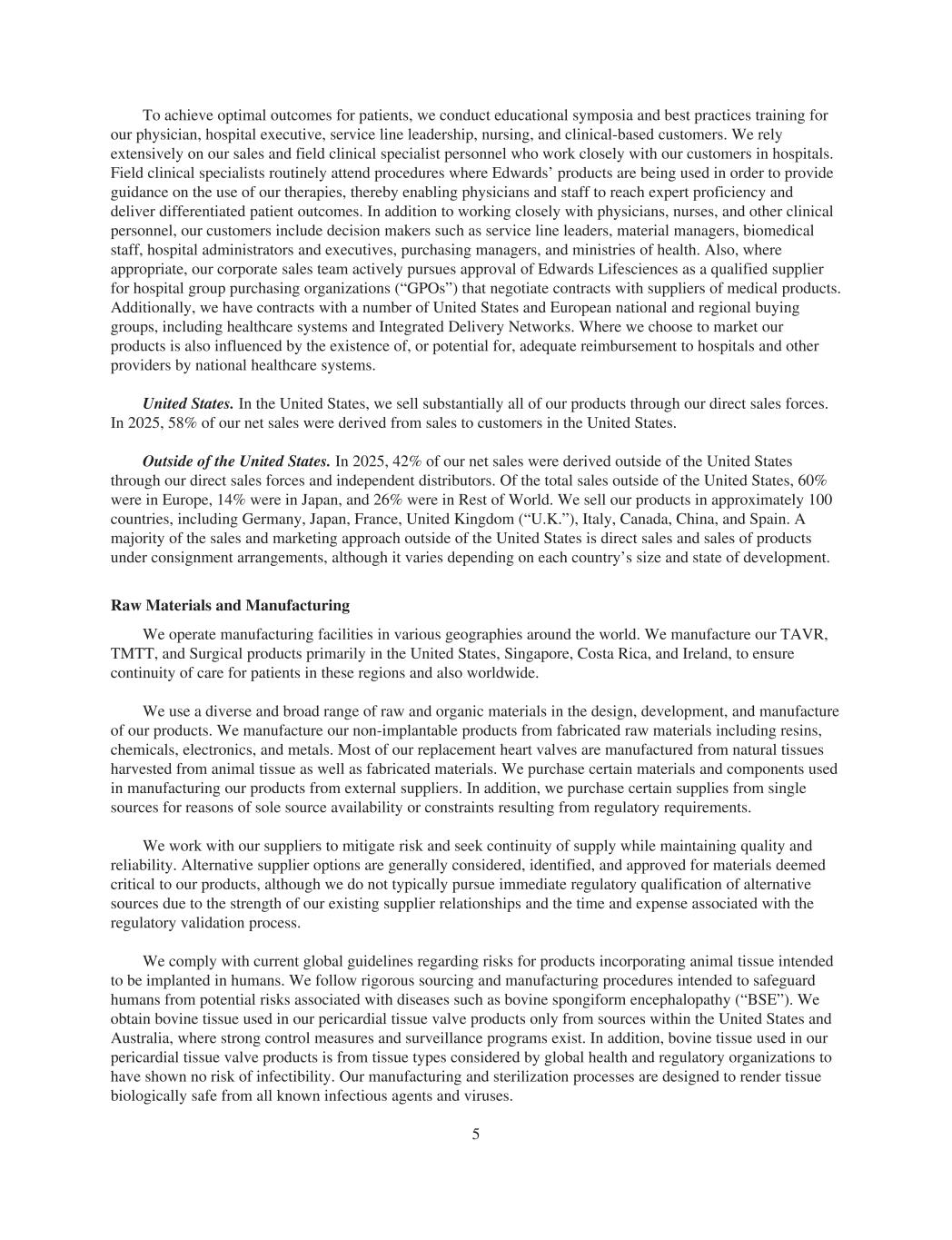 To achieve optimal outcomes for patients, we conduct educational symposia and best practices training for our physician, hospital executive, service line leadership, nursing, and clinical-based customers. We rely extensively on our sales and field clinical specialist personnel who work closely with our customers in hospitals. Field clinical specialists routinely attend procedures where Edwards’ products are being used in order to provide guidance on the use of our therapies, thereby enabling physicians and staff to reach expert proficiency and deliver differentiated patient outcomes. In addition to working closely with physicians, nurses, and other clinical personnel, our customers include decision makers such as service line leaders, material managers, biomedical staff, hospital administrators and executives, purchasing managers, and ministries of health. Also, where appropriate, our corporate sales team actively pursues approval of Edwards Lifesciences as a qualified supplier for hospital group purchasing organizations (“GPOs”) that negotiate contracts with suppliers of medical products. Additionally, we have contracts with a number of United States and European national and regional buying groups, including healthcare systems and Integrated Delivery Networks. Where we choose to market our products is also influenced by the existence of, or potential for, adequate reimbursement to hospitals and other providers by national healthcare systems. United States. In the United States, we sell substantially all of our products through our direct sales forces. In 2025, 58% of our net sales were derived from sales to customers in the United States. Outside of the United States. In 2025, 42% of our net sales were derived outside of the United States through our direct sales forces and independent distributors. Of the total sales outside of the United States, 60% were in Europe, 14% were in Japan, and 26% were in Rest of World. We sell our products in approximately 100 countries, including Germany, Japan, France, United Kingdom (“U.K.”), Italy, Canada, China, and Spain. A majority of the sales and marketing approach outside of the United States is direct sales and sales of products under consignment arrangements, although it varies depending on each country’s size and state of development. Raw Materials and Manufacturing We operate manufacturing facilities in various geographies around the world. We manufacture our TAVR, TMTT, and Surgical products primarily in the United States, Singapore, Costa Rica, and Ireland, to ensure continuity of care for patients in these regions and also worldwide. We use a diverse and broad range of raw and organic materials in the design, development, and manufacture of our products. We manufacture our non-implantable products from fabricated raw materials including resins, chemicals, electronics, and metals. Most of our replacement heart valves are manufactured from natural tissues harvested from animal tissue as well as fabricated materials. We purchase certain materials and components used in manufacturing our products from external suppliers. In addition, we purchase certain supplies from single sources for reasons of sole source availability or constraints resulting from regulatory requirements. We work with our suppliers to mitigate risk and seek continuity of supply while maintaining quality and reliability. Alternative supplier options are generally considered, identified, and approved for materials deemed critical to our products, although we do not typically pursue immediate regulatory qualification of alternative sources due to the strength of our existing supplier relationships and the time and expense associated with the regulatory validation process. We comply with current global guidelines regarding risks for products incorporating animal tissue intended to be implanted in humans. We follow rigorous sourcing and manufacturing procedures intended to safeguard humans from potential risks associated with diseases such as bovine spongiform encephalopathy (“BSE”). We obtain bovine tissue used in our pericardial tissue valve products only from sources within the United States and Australia, where strong control measures and surveillance programs exist. In addition, bovine tissue used in our pericardial tissue valve products is from tissue types considered by global health and regulatory organizations to have shown no risk of infectibility. Our manufacturing and sterilization processes are designed to render tissue biologically safe from all known infectious agents and viruses. 5