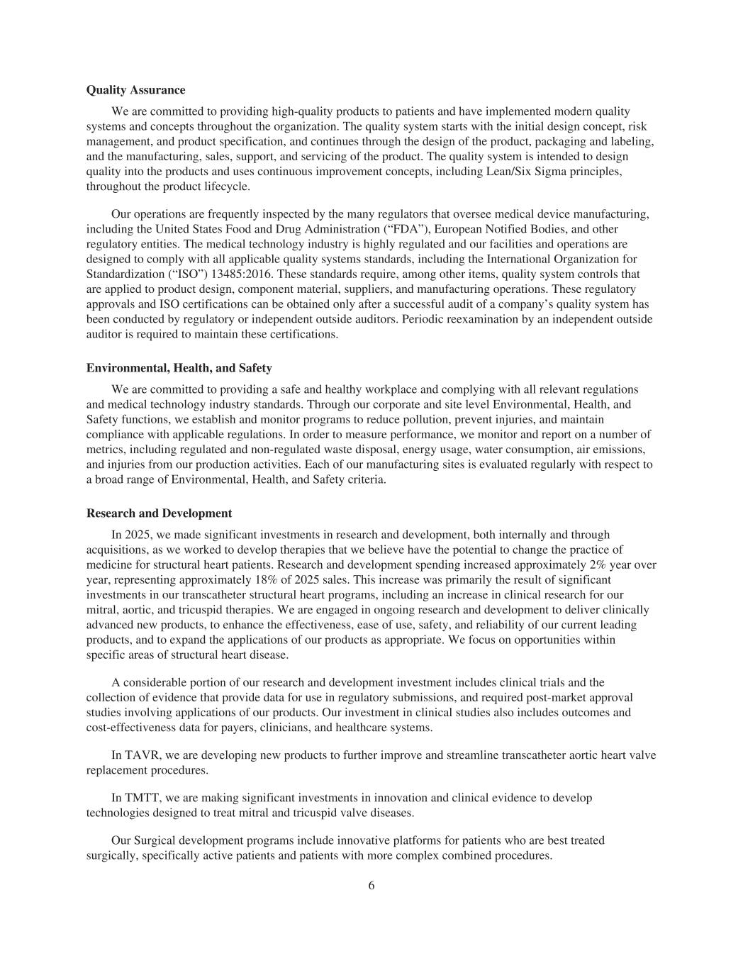Quality Assurance We are committed to providing high-quality products to patients and have implemented modern quality systems and concepts throughout the organization. The quality system starts with the initial design concept, risk management, and product specification, and continues through the design of the product, packaging and labeling, and the manufacturing, sales, support, and servicing of the product. The quality system is intended to design quality into the products and uses continuous improvement concepts, including Lean/Six Sigma principles, throughout the product lifecycle. Our operations are frequently inspected by the many regulators that oversee medical device manufacturing, including the United States Food and Drug Administration (“FDA”), European Notified Bodies, and other regulatory entities. The medical technology industry is highly regulated and our facilities and operations are designed to comply with all applicable quality systems standards, including the International Organization for Standardization (“ISO”) 13485:2016. These standards require, among other items, quality system controls that are applied to product design, component material, suppliers, and manufacturing operations. These regulatory approvals and ISO certifications can be obtained only after a successful audit of a company’s quality system has been conducted by regulatory or independent outside auditors. Periodic reexamination by an independent outside auditor is required to maintain these certifications. Environmental, Health, and Safety We are committed to providing a safe and healthy workplace and complying with all relevant regulations and medical technology industry standards. Through our corporate and site level Environmental, Health, and Safety functions, we establish and monitor programs to reduce pollution, prevent injuries, and maintain compliance with applicable regulations. In order to measure performance, we monitor and report on a number of metrics, including regulated and non-regulated waste disposal, energy usage, water consumption, air emissions, and injuries from our production activities. Each of our manufacturing sites is evaluated regularly with respect to a broad range of Environmental, Health, and Safety criteria. Research and Development In 2025, we made significant investments in research and development, both internally and through acquisitions, as we worked to develop therapies that we believe have the potential to change the practice of medicine for structural heart patients. Research and development spending increased approximately 2% year over year, representing approximately 18% of 2025 sales. This increase was primarily the result of significant investments in our transcatheter structural heart programs, including an increase in clinical research for our mitral, aortic, and tricuspid therapies. We are engaged in ongoing research and development to deliver clinically advanced new products, to enhance the effectiveness, ease of use, safety, and reliability of our current leading products, and to expand the applications of our products as appropriate. We focus on opportunities within specific areas of structural heart disease. A considerable portion of our research and development investment includes clinical trials and the collection of evidence that provide data for use in regulatory submissions, and required post-market approval studies involving applications of our products. Our investment in clinical studies also includes outcomes and cost-effectiveness data for payers, clinicians, and healthcare systems. In TAVR, we are developing new products to further improve and streamline transcatheter aortic heart valve replacement procedures. In TMTT, we are making significant investments in innovation and clinical evidence to develop technologies designed to treat mitral and tricuspid valve diseases. Our Surgical development programs include innovative platforms for patients who are best treated surgically, specifically active patients and patients with more complex combined procedures. 6