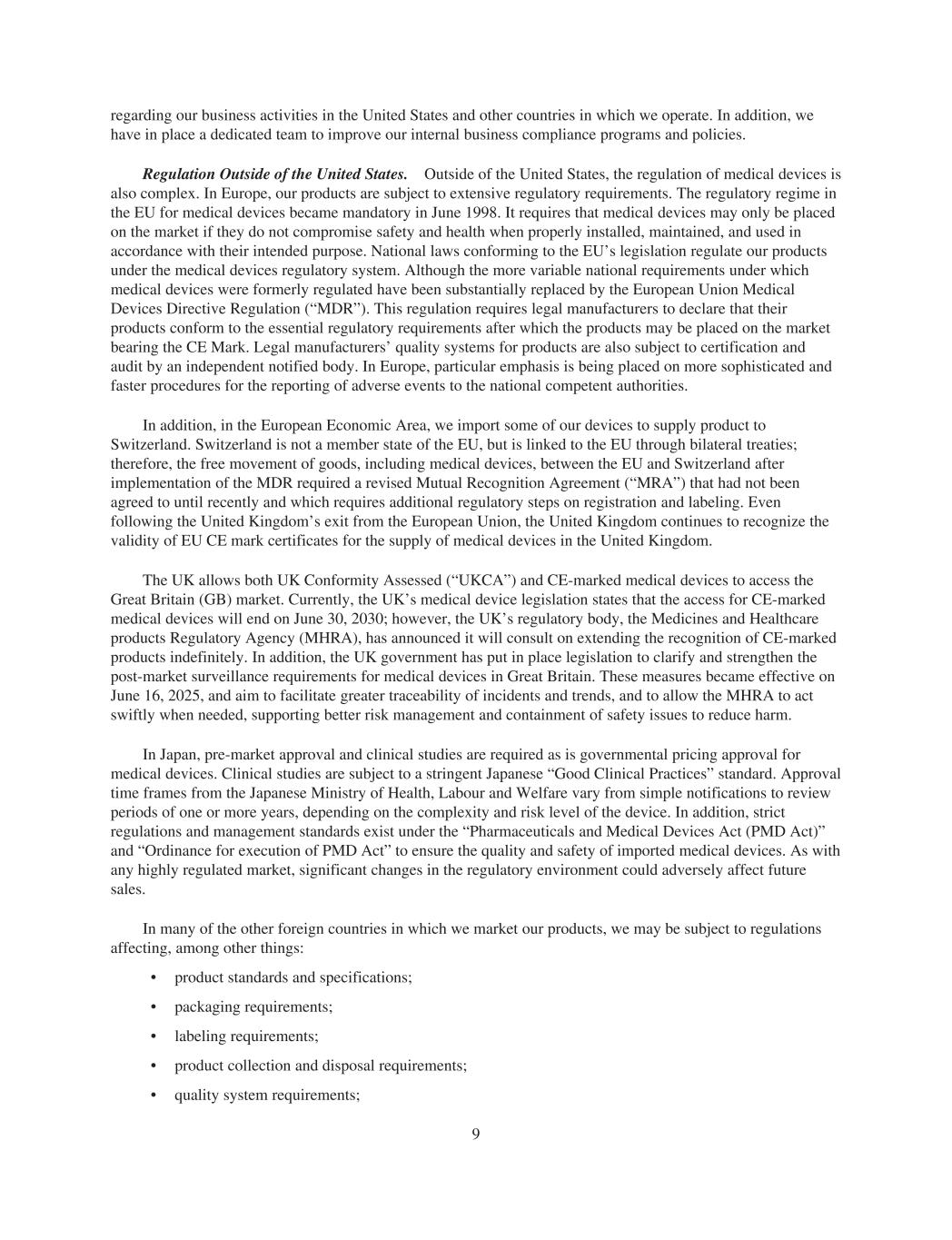 regarding our business activities in the United States and other countries in which we operate. In addition, we have in place a dedicated team to improve our internal business compliance programs and policies. Regulation Outside of the United States. Outside of the United States, the regulation of medical devices is also complex. In Europe, our products are subject to extensive regulatory requirements. The regulatory regime in the EU for medical devices became mandatory in June 1998. It requires that medical devices may only be placed on the market if they do not compromise safety and health when properly installed, maintained, and used in accordance with their intended purpose. National laws conforming to the EU’s legislation regulate our products under the medical devices regulatory system. Although the more variable national requirements under which medical devices were formerly regulated have been substantially replaced by the European Union Medical Devices Directive Regulation (“MDR”). This regulation requires legal manufacturers to declare that their products conform to the essential regulatory requirements after which the products may be placed on the market bearing the CE Mark. Legal manufacturers’ quality systems for products are also subject to certification and audit by an independent notified body. In Europe, particular emphasis is being placed on more sophisticated and faster procedures for the reporting of adverse events to the national competent authorities. In addition, in the European Economic Area, we import some of our devices to supply product to Switzerland. Switzerland is not a member state of the EU, but is linked to the EU through bilateral treaties; therefore, the free movement of goods, including medical devices, between the EU and Switzerland after implementation of the MDR required a revised Mutual Recognition Agreement (“MRA”) that had not been agreed to until recently and which requires additional regulatory steps on registration and labeling. Even following the United Kingdom’s exit from the European Union, the United Kingdom continues to recognize the validity of EU CE mark certificates for the supply of medical devices in the United Kingdom. The UK allows both UK Conformity Assessed (“UKCA”) and CE-marked medical devices to access the Great Britain (GB) market. Currently, the UK’s medical device legislation states that the access for CE-marked medical devices will end on June 30, 2030; however, the UK’s regulatory body, the Medicines and Healthcare products Regulatory Agency (MHRA), has announced it will consult on extending the recognition of CE-marked products indefinitely. In addition, the UK government has put in place legislation to clarify and strengthen the post-market surveillance requirements for medical devices in Great Britain. These measures became effective on June 16, 2025, and aim to facilitate greater traceability of incidents and trends, and to allow the MHRA to act swiftly when needed, supporting better risk management and containment of safety issues to reduce harm. In Japan, pre-market approval and clinical studies are required as is governmental pricing approval for medical devices. Clinical studies are subject to a stringent Japanese “Good Clinical Practices” standard. Approval time frames from the Japanese Ministry of Health, Labour and Welfare vary from simple notifications to review periods of one or more years, depending on the complexity and risk level of the device. In addition, strict regulations and management standards exist under the “Pharmaceuticals and Medical Devices Act (PMD Act)” and “Ordinance for execution of PMD Act” to ensure the quality and safety of imported medical devices. As with any highly regulated market, significant changes in the regulatory environment could adversely affect future sales. In many of the other foreign countries in which we market our products, we may be subject to regulations affecting, among other things: • product standards and specifications; • packaging requirements; • labeling requirements; • product collection and disposal requirements; • quality system requirements; 9