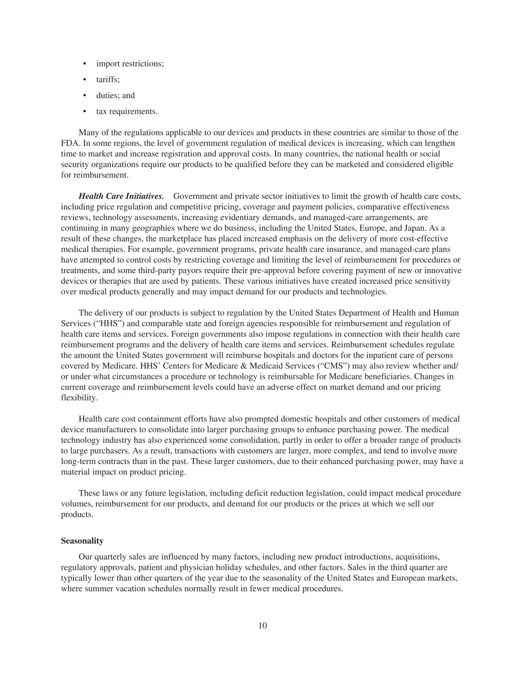 • import restrictions; • tariffs; • duties; and • tax requirements. Many of the regulations applicable to our devices and products in these countries are similar to those of the FDA. In some regions, the level of government regulation of medical devices is increasing, which can lengthen time to market and increase registration and approval costs. In many countries, the national health or social security organizations require our products to be qualified before they can be marketed and considered eligible for reimbursement. Health Care Initiatives. Government and private sector initiatives to limit the growth of health care costs, including price regulation and competitive pricing, coverage and payment policies, comparative effectiveness reviews, technology assessments, increasing evidentiary demands, and managed-care arrangements, are continuing in many geographies where we do business, including the United States, Europe, and Japan. As a result of these changes, the marketplace has placed increased emphasis on the delivery of more cost-effective medical therapies. For example, government programs, private health care insurance, and managed-care plans have attempted to control costs by restricting coverage and limiting the level of reimbursement for procedures or treatments, and some third-party payors require their pre-approval before covering payment of new or innovative devices or therapies that are used by patients. These various initiatives have created increased price sensitivity over medical products generally and may impact demand for our products and technologies. The delivery of our products is subject to regulation by the United States Department of Health and Human Services (“HHS”) and comparable state and foreign agencies responsible for reimbursement and regulation of health care items and services. Foreign governments also impose regulations in connection with their health care reimbursement programs and the delivery of health care items and services. Reimbursement schedules regulate the amount the United States government will reimburse hospitals and doctors for the inpatient care of persons covered by Medicare. HHS’ Centers for Medicare & Medicaid Services (“CMS”) may also review whether and/ or under what circumstances a procedure or technology is reimbursable for Medicare beneficiaries. Changes in current coverage and reimbursement levels could have an adverse effect on market demand and our pricing flexibility. Health care cost containment efforts have also prompted domestic hospitals and other customers of medical device manufacturers to consolidate into larger purchasing groups to enhance purchasing power. The medical technology industry has also experienced some consolidation, partly in order to offer a broader range of products to large purchasers. As a result, transactions with customers are larger, more complex, and tend to involve more long-term contracts than in the past. These larger customers, due to their enhanced purchasing power, may have a material impact on product pricing. These laws or any future legislation, including deficit reduction legislation, could impact medical procedure volumes, reimbursement for our products, and demand for our products or the prices at which we sell our products. Seasonality Our quarterly sales are influenced by many factors, including new product introductions, acquisitions, regulatory approvals, patient and physician holiday schedules, and other factors. Sales in the third quarter are typically lower than other quarters of the year due to the seasonality of the United States and European markets, where summer vacation schedules normally result in fewer medical procedures. 10