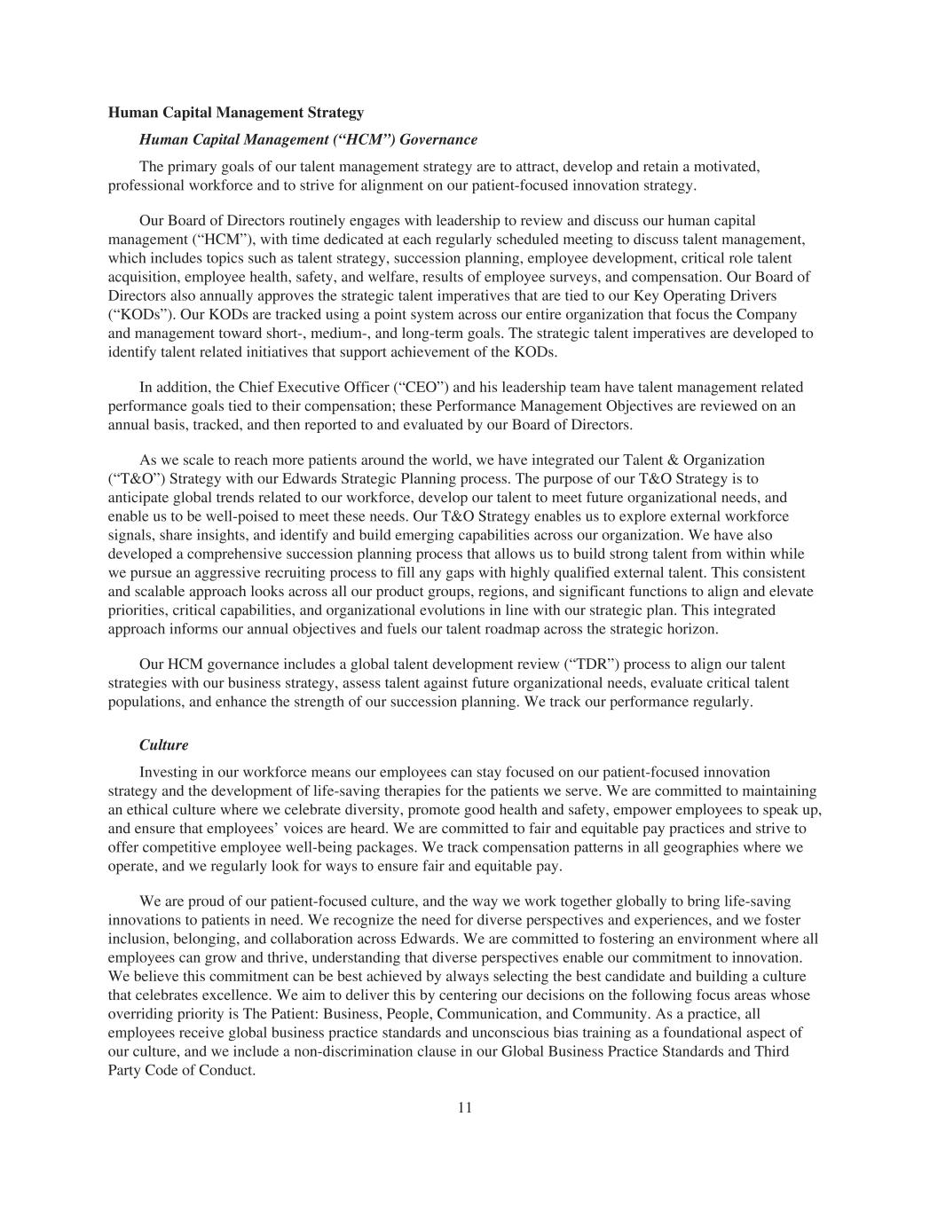 Human Capital Management Strategy Human Capital Management (“HCM”) Governance The primary goals of our talent management strategy are to attract, develop and retain a motivated, professional workforce and to strive for alignment on our patient-focused innovation strategy. Our Board of Directors routinely engages with leadership to review and discuss our human capital management (“HCM”), with time dedicated at each regularly scheduled meeting to discuss talent management, which includes topics such as talent strategy, succession planning, employee development, critical role talent acquisition, employee health, safety, and welfare, results of employee surveys, and compensation. Our Board of Directors also annually approves the strategic talent imperatives that are tied to our Key Operating Drivers (“KODs”). Our KODs are tracked using a point system across our entire organization that focus the Company and management toward short-, medium-, and long-term goals. The strategic talent imperatives are developed to identify talent related initiatives that support achievement of the KODs. In addition, the Chief Executive Officer (“CEO”) and his leadership team have talent management related performance goals tied to their compensation; these Performance Management Objectives are reviewed on an annual basis, tracked, and then reported to and evaluated by our Board of Directors. As we scale to reach more patients around the world, we have integrated our Talent & Organization (“T&O”) Strategy with our Edwards Strategic Planning process. The purpose of our T&O Strategy is to anticipate global trends related to our workforce, develop our talent to meet future organizational needs, and enable us to be well-poised to meet these needs. Our T&O Strategy enables us to explore external workforce signals, share insights, and identify and build emerging capabilities across our organization. We have also developed a comprehensive succession planning process that allows us to build strong talent from within while we pursue an aggressive recruiting process to fill any gaps with highly qualified external talent. This consistent and scalable approach looks across all our product groups, regions, and significant functions to align and elevate priorities, critical capabilities, and organizational evolutions in line with our strategic plan. This integrated approach informs our annual objectives and fuels our talent roadmap across the strategic horizon. Our HCM governance includes a global talent development review (“TDR”) process to align our talent strategies with our business strategy, assess talent against future organizational needs, evaluate critical talent populations, and enhance the strength of our succession planning. We track our performance regularly. Culture Investing in our workforce means our employees can stay focused on our patient-focused innovation strategy and the development of life-saving therapies for the patients we serve. We are committed to maintaining an ethical culture where we celebrate diversity, promote good health and safety, empower employees to speak up, and ensure that employees’ voices are heard. We are committed to fair and equitable pay practices and strive to offer competitive employee well-being packages. We track compensation patterns in all geographies where we operate, and we regularly look for ways to ensure fair and equitable pay. We are proud of our patient-focused culture, and the way we work together globally to bring life-saving innovations to patients in need. We recognize the need for diverse perspectives and experiences, and we foster inclusion, belonging, and collaboration across Edwards. We are committed to fostering an environment where all employees can grow and thrive, understanding that diverse perspectives enable our commitment to innovation. We believe this commitment can be best achieved by always selecting the best candidate and building a culture that celebrates excellence. We aim to deliver this by centering our decisions on the following focus areas whose overriding priority is The Patient: Business, People, Communication, and Community. As a practice, all employees receive global business practice standards and unconscious bias training as a foundational aspect of our culture, and we include a non-discrimination clause in our Global Business Practice Standards and Third Party Code of Conduct. 11