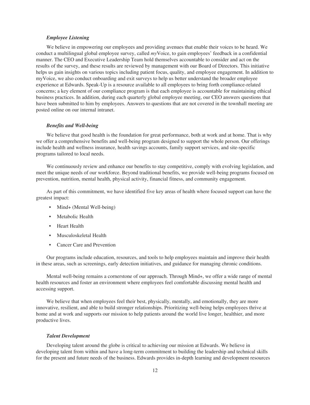 Employee Listening We believe in empowering our employees and providing avenues that enable their voices to be heard. We conduct a multilingual global employee survey, called myVoice, to gain employees’ feedback in a confidential manner. The CEO and Executive Leadership Team hold themselves accountable to consider and act on the results of the survey, and these results are reviewed by management with our Board of Directors. This initiative helps us gain insights on various topics including patient focus, quality, and employee engagement. In addition to myVoice, we also conduct onboarding and exit surveys to help us better understand the broader employee experience at Edwards. Speak-Up is a resource available to all employees to bring forth compliance-related concerns; a key element of our compliance program is that each employee is accountable for maintaining ethical business practices. In addition, during each quarterly global employee meeting, our CEO answers questions that have been submitted to him by employees. Answers to questions that are not covered in the townhall meeting are posted online on our internal intranet. Benefits and Well-being We believe that good health is the foundation for great performance, both at work and at home. That is why we offer a comprehensive benefits and well-being program designed to support the whole person. Our offerings include health and wellness insurance, health savings accounts, family support services, and site-specific programs tailored to local needs. We continuously review and enhance our benefits to stay competitive, comply with evolving legislation, and meet the unique needs of our workforce. Beyond traditional benefits, we provide well-being programs focused on prevention, nutrition, mental health, physical activity, financial fitness, and community engagement. As part of this commitment, we have identified five key areas of health where focused support can have the greatest impact: • Mind+ (Mental Well-being) • Metabolic Health • Heart Health • Musculoskeletal Health • Cancer Care and Prevention Our programs include education, resources, and tools to help employees maintain and improve their health in these areas, such as screenings, early detection initiatives, and guidance for managing chronic conditions. Mental well-being remains a cornerstone of our approach. Through Mind+, we offer a wide range of mental health resources and foster an environment where employees feel comfortable discussing mental health and accessing support. We believe that when employees feel their best, physically, mentally, and emotionally, they are more innovative, resilient, and able to build stronger relationships. Prioritizing well-being helps employees thrive at home and at work and supports our mission to help patients around the world live longer, healthier, and more productive lives. Talent Development Developing talent around the globe is critical to achieving our mission at Edwards. We believe in developing talent from within and have a long-term commitment to building the leadership and technical skills for the present and future needs of the business. Edwards provides in-depth learning and development resources 12