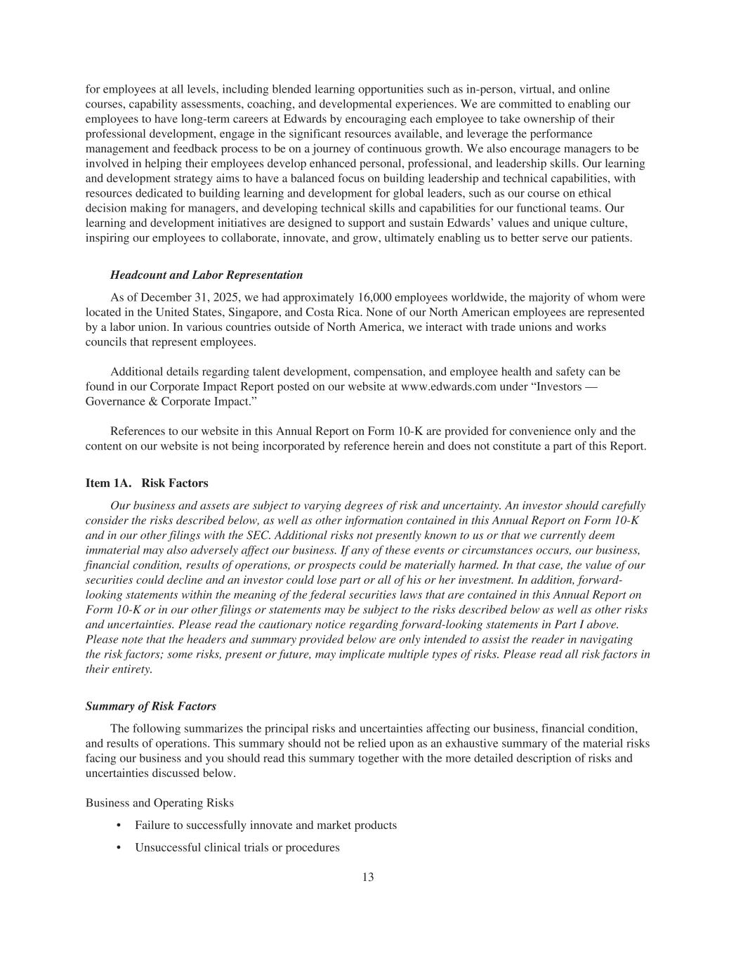 for employees at all levels, including blended learning opportunities such as in-person, virtual, and online courses, capability assessments, coaching, and developmental experiences. We are committed to enabling our employees to have long-term careers at Edwards by encouraging each employee to take ownership of their professional development, engage in the significant resources available, and leverage the performance management and feedback process to be on a journey of continuous growth. We also encourage managers to be involved in helping their employees develop enhanced personal, professional, and leadership skills. Our learning and development strategy aims to have a balanced focus on building leadership and technical capabilities, with resources dedicated to building learning and development for global leaders, such as our course on ethical decision making for managers, and developing technical skills and capabilities for our functional teams. Our learning and development initiatives are designed to support and sustain Edwards’ values and unique culture, inspiring our employees to collaborate, innovate, and grow, ultimately enabling us to better serve our patients. Headcount and Labor Representation As of December 31, 2025, we had approximately 16,000 employees worldwide, the majority of whom were located in the United States, Singapore, and Costa Rica. None of our North American employees are represented by a labor union. In various countries outside of North America, we interact with trade unions and works councils that represent employees. Additional details regarding talent development, compensation, and employee health and safety can be found in our Corporate Impact Report posted on our website at www.edwards.com under “Investors — Governance & Corporate Impact.” References to our website in this Annual Report on Form 10-K are provided for convenience only and the content on our website is not being incorporated by reference herein and does not constitute a part of this Report. Item 1A. Risk Factors Our business and assets are subject to varying degrees of risk and uncertainty. An investor should carefully consider the risks described below, as well as other information contained in this Annual Report on Form 10-K and in our other filings with the SEC. Additional risks not presently known to us or that we currently deem immaterial may also adversely affect our business. If any of these events or circumstances occurs, our business, financial condition, results of operations, or prospects could be materially harmed. In that case, the value of our securities could decline and an investor could lose part or all of his or her investment. In addition, forward- looking statements within the meaning of the federal securities laws that are contained in this Annual Report on Form 10-K or in our other filings or statements may be subject to the risks described below as well as other risks and uncertainties. Please read the cautionary notice regarding forward-looking statements in Part I above. Please note that the headers and summary provided below are only intended to assist the reader in navigating the risk factors; some risks, present or future, may implicate multiple types of risks. Please read all risk factors in their entirety. Summary of Risk Factors The following summarizes the principal risks and uncertainties affecting our business, financial condition, and results of operations. This summary should not be relied upon as an exhaustive summary of the material risks facing our business and you should read this summary together with the more detailed description of risks and uncertainties discussed below. Business and Operating Risks • Failure to successfully innovate and market products • Unsuccessful clinical trials or procedures 13