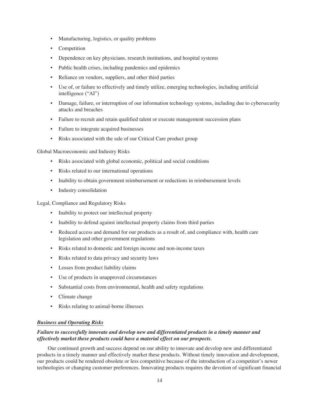 • Manufacturing, logistics, or quality problems • Competition • Dependence on key physicians. research institutions, and hospital systems • Public health crises, including pandemics and epidemics • Reliance on vendors, suppliers, and other third parties • Use of, or failure to effectively and timely utilize, emerging technologies, including artificial intelligence (“AI”) • Damage, failure, or interruption of our information technology systems, including due to cybersecurity attacks and breaches • Failure to recruit and retain qualified talent or execute management succession plans • Failure to integrate acquired businesses • Risks associated with the sale of our Critical Care product group Global Macroeconomic and Industry Risks • Risks associated with global economic, political and social conditions • Risks related to our international operations • Inability to obtain government reimbursement or reductions in reimbursement levels • Industry consolidation Legal, Compliance and Regulatory Risks • Inability to protect our intellectual property • Inability to defend against intellectual property claims from third parties • Reduced access and demand for our products as a result of, and compliance with, health care legislation and other government regulations • Risks related to domestic and foreign income and non-income taxes • Risks related to data privacy and security laws • Losses from product liability claims • Use of products in unapproved circumstances • Substantial costs from environmental, health and safety regulations • Climate change • Risks relating to animal-borne illnesses Business and Operating Risks Failure to successfully innovate and develop new and differentiated products in a timely manner and effectively market these products could have a material effect on our prospects. Our continued growth and success depend on our ability to innovate and develop new and differentiated products in a timely manner and effectively market these products. Without timely innovation and development, our products could be rendered obsolete or less competitive because of the introduction of a competitor’s newer technologies or changing customer preferences. Innovating products requires the devotion of significant financial 14