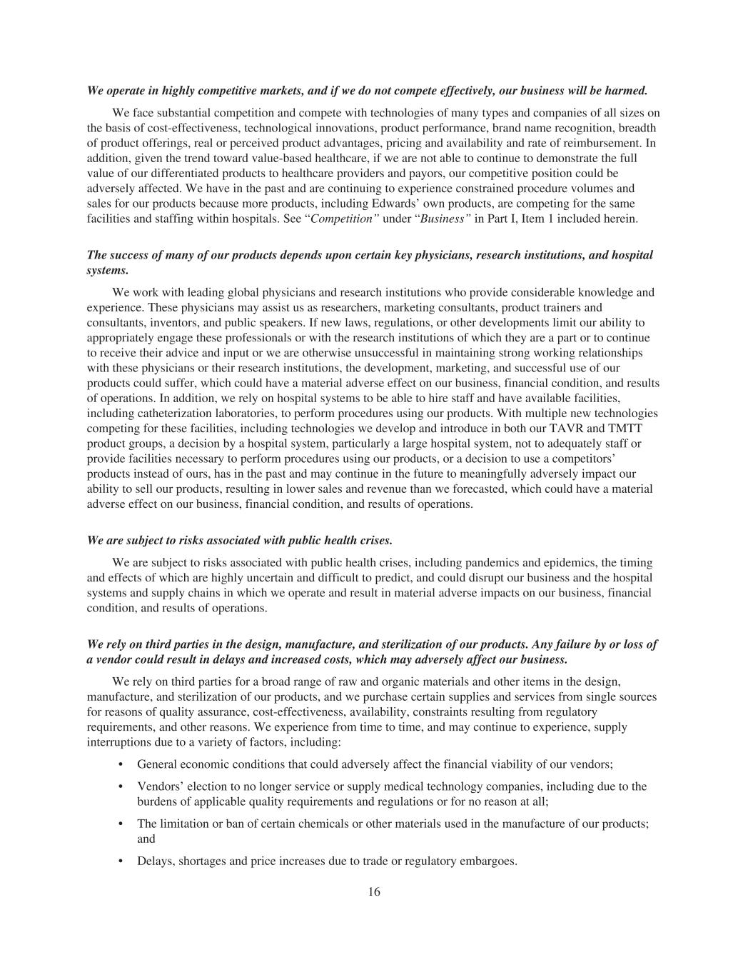 We operate in highly competitive markets, and if we do not compete effectively, our business will be harmed. We face substantial competition and compete with technologies of many types and companies of all sizes on the basis of cost-effectiveness, technological innovations, product performance, brand name recognition, breadth of product offerings, real or perceived product advantages, pricing and availability and rate of reimbursement. In addition, given the trend toward value-based healthcare, if we are not able to continue to demonstrate the full value of our differentiated products to healthcare providers and payors, our competitive position could be adversely affected. We have in the past and are continuing to experience constrained procedure volumes and sales for our products because more products, including Edwards’ own products, are competing for the same facilities and staffing within hospitals. See “Competition” under “Business” in Part I, Item 1 included herein. The success of many of our products depends upon certain key physicians, research institutions, and hospital systems. We work with leading global physicians and research institutions who provide considerable knowledge and experience. These physicians may assist us as researchers, marketing consultants, product trainers and consultants, inventors, and public speakers. If new laws, regulations, or other developments limit our ability to appropriately engage these professionals or with the research institutions of which they are a part or to continue to receive their advice and input or we are otherwise unsuccessful in maintaining strong working relationships with these physicians or their research institutions, the development, marketing, and successful use of our products could suffer, which could have a material adverse effect on our business, financial condition, and results of operations. In addition, we rely on hospital systems to be able to hire staff and have available facilities, including catheterization laboratories, to perform procedures using our products. With multiple new technologies competing for these facilities, including technologies we develop and introduce in both our TAVR and TMTT product groups, a decision by a hospital system, particularly a large hospital system, not to adequately staff or provide facilities necessary to perform procedures using our products, or a decision to use a competitors’ products instead of ours, has in the past and may continue in the future to meaningfully adversely impact our ability to sell our products, resulting in lower sales and revenue than we forecasted, which could have a material adverse effect on our business, financial condition, and results of operations. We are subject to risks associated with public health crises. We are subject to risks associated with public health crises, including pandemics and epidemics, the timing and effects of which are highly uncertain and difficult to predict, and could disrupt our business and the hospital systems and supply chains in which we operate and result in material adverse impacts on our business, financial condition, and results of operations. We rely on third parties in the design, manufacture, and sterilization of our products. Any failure by or loss of a vendor could result in delays and increased costs, which may adversely affect our business. We rely on third parties for a broad range of raw and organic materials and other items in the design, manufacture, and sterilization of our products, and we purchase certain supplies and services from single sources for reasons of quality assurance, cost-effectiveness, availability, constraints resulting from regulatory requirements, and other reasons. We experience from time to time, and may continue to experience, supply interruptions due to a variety of factors, including: • General economic conditions that could adversely affect the financial viability of our vendors; • Vendors’ election to no longer service or supply medical technology companies, including due to the burdens of applicable quality requirements and regulations or for no reason at all; • The limitation or ban of certain chemicals or other materials used in the manufacture of our products; and • Delays, shortages and price increases due to trade or regulatory embargoes. 16