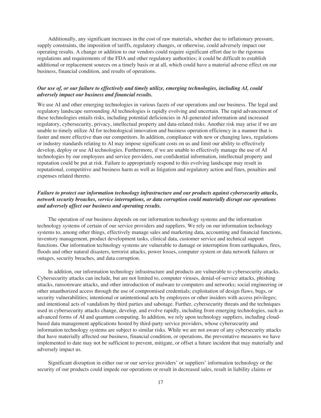 Additionally, any significant increases in the cost of raw materials, whether due to inflationary pressure, supply constraints, the imposition of tariffs, regulatory changes, or otherwise, could adversely impact our operating results. A change or addition to our vendors could require significant effort due to the rigorous regulations and requirements of the FDA and other regulatory authorities; it could be difficult to establish additional or replacement sources on a timely basis or at all, which could have a material adverse effect on our business, financial condition, and results of operations. Our use of, or our failure to effectively and timely utilize, emerging technologies, including AI, could adversely impact our business and financial results. We use AI and other emerging technologies in various facets of our operations and our business. The legal and regulatory landscape surrounding AI technologies is rapidly evolving and uncertain. The rapid advancement of these technologies entails risks, including potential deficiencies in AI-generated information and increased regulatory, cybersecurity, privacy, intellectual property and data-related risks. Another risk may arise if we are unable to timely utilize AI for technological innovation and business operation efficiency in a manner that is faster and more effective than our competitors. In addition, compliance with new or changing laws, regulations or industry standards relating to AI may impose significant costs on us and limit our ability to effectively develop, deploy or use AI technologies. Furthermore, if we are unable to effectively manage the use of AI technologies by our employees and service providers, our confidential information, intellectual property and reputation could be put at risk. Failure to appropriately respond to this evolving landscape may result in reputational, competitive and business harm as well as litigation and regulatory action and fines, penalties and expenses related thereto. Failure to protect our information technology infrastructure and our products against cybersecurity attacks, network security breaches, service interruptions, or data corruption could materially disrupt our operations and adversely affect our business and operating results. The operation of our business depends on our information technology systems and the information technology systems of certain of our service providers and suppliers. We rely on our information technology systems to, among other things, effectively manage sales and marketing data, accounting and financial functions, inventory management, product development tasks, clinical data, customer service and technical support functions. Our information technology systems are vulnerable to damage or interruption from earthquakes, fires, floods and other natural disasters, terrorist attacks, power losses, computer system or data network failures or outages, security breaches, and data corruption. In addition, our information technology infrastructure and products are vulnerable to cybersecurity attacks. Cybersecurity attacks can include, but are not limited to, computer viruses, denial-of-service attacks, phishing attacks, ransomware attacks, and other introduction of malware to computers and networks; social engineering or other unauthorized access through the use of compromised credentials; exploitation of design flaws, bugs, or security vulnerabilities; intentional or unintentional acts by employees or other insiders with access privileges; and intentional acts of vandalism by third parties and sabotage. Further, cybersecurity threats and the techniques used in cybersecurity attacks change, develop, and evolve rapidly, including from emerging technologies, such as advanced forms of AI and quantum computing. In addition, we rely upon technology suppliers, including cloud- based data management applications hosted by third-party service providers, whose cybersecurity and information technology systems are subject to similar risks. While we are not aware of any cybersecurity attacks that have materially affected our business, financial condition, or operations, the preventative measures we have implemented to date may not be sufficient to prevent, mitigate, or offset a future incident that may materially and adversely impact us. Significant disruption in either our or our service providers’ or suppliers’ information technology or the security of our products could impede our operations or result in decreased sales, result in liability claims or 17