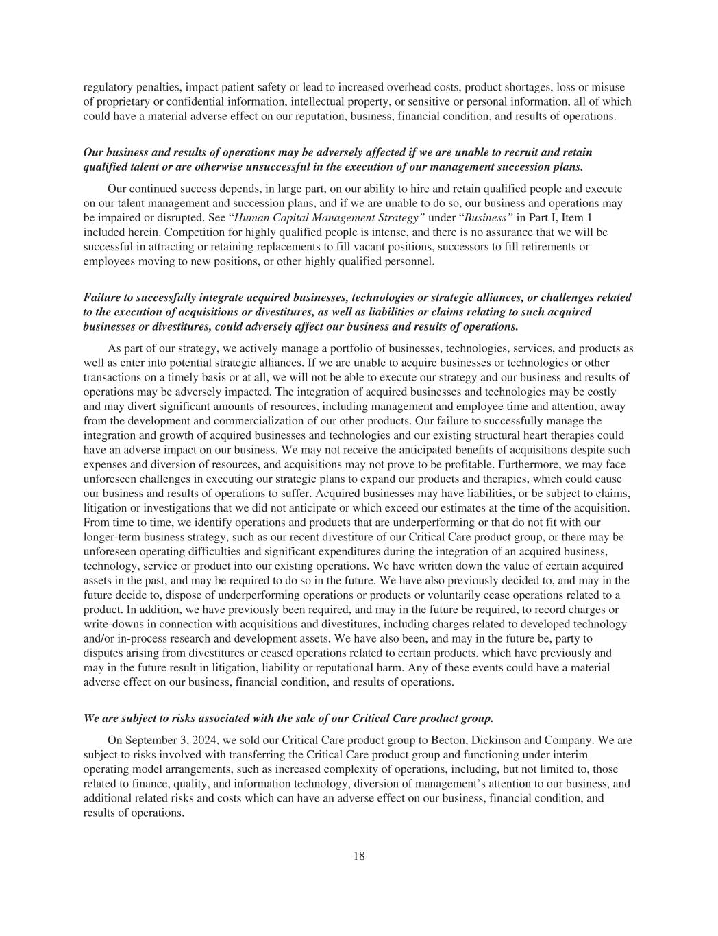 regulatory penalties, impact patient safety or lead to increased overhead costs, product shortages, loss or misuse of proprietary or confidential information, intellectual property, or sensitive or personal information, all of which could have a material adverse effect on our reputation, business, financial condition, and results of operations. Our business and results of operations may be adversely affected if we are unable to recruit and retain qualified talent or are otherwise unsuccessful in the execution of our management succession plans. Our continued success depends, in large part, on our ability to hire and retain qualified people and execute on our talent management and succession plans, and if we are unable to do so, our business and operations may be impaired or disrupted. See “Human Capital Management Strategy” under “Business” in Part I, Item 1 included herein. Competition for highly qualified people is intense, and there is no assurance that we will be successful in attracting or retaining replacements to fill vacant positions, successors to fill retirements or employees moving to new positions, or other highly qualified personnel. Failure to successfully integrate acquired businesses, technologies or strategic alliances, or challenges related to the execution of acquisitions or divestitures, as well as liabilities or claims relating to such acquired businesses or divestitures, could adversely affect our business and results of operations. As part of our strategy, we actively manage a portfolio of businesses, technologies, services, and products as well as enter into potential strategic alliances. If we are unable to acquire businesses or technologies or other transactions on a timely basis or at all, we will not be able to execute our strategy and our business and results of operations may be adversely impacted. The integration of acquired businesses and technologies may be costly and may divert significant amounts of resources, including management and employee time and attention, away from the development and commercialization of our other products. Our failure to successfully manage the integration and growth of acquired businesses and technologies and our existing structural heart therapies could have an adverse impact on our business. We may not receive the anticipated benefits of acquisitions despite such expenses and diversion of resources, and acquisitions may not prove to be profitable. Furthermore, we may face unforeseen challenges in executing our strategic plans to expand our products and therapies, which could cause our business and results of operations to suffer. Acquired businesses may have liabilities, or be subject to claims, litigation or investigations that we did not anticipate or which exceed our estimates at the time of the acquisition. From time to time, we identify operations and products that are underperforming or that do not fit with our longer-term business strategy, such as our recent divestiture of our Critical Care product group, or there may be unforeseen operating difficulties and significant expenditures during the integration of an acquired business, technology, service or product into our existing operations. We have written down the value of certain acquired assets in the past, and may be required to do so in the future. We have also previously decided to, and may in the future decide to, dispose of underperforming operations or products or voluntarily cease operations related to a product. In addition, we have previously been required, and may in the future be required, to record charges or write-downs in connection with acquisitions and divestitures, including charges related to developed technology and/or in-process research and development assets. We have also been, and may in the future be, party to disputes arising from divestitures or ceased operations related to certain products, which have previously and may in the future result in litigation, liability or reputational harm. Any of these events could have a material adverse effect on our business, financial condition, and results of operations. We are subject to risks associated with the sale of our Critical Care product group. On September 3, 2024, we sold our Critical Care product group to Becton, Dickinson and Company. We are subject to risks involved with transferring the Critical Care product group and functioning under interim operating model arrangements, such as increased complexity of operations, including, but not limited to, those related to finance, quality, and information technology, diversion of management’s attention to our business, and additional related risks and costs which can have an adverse effect on our business, financial condition, and results of operations. 18