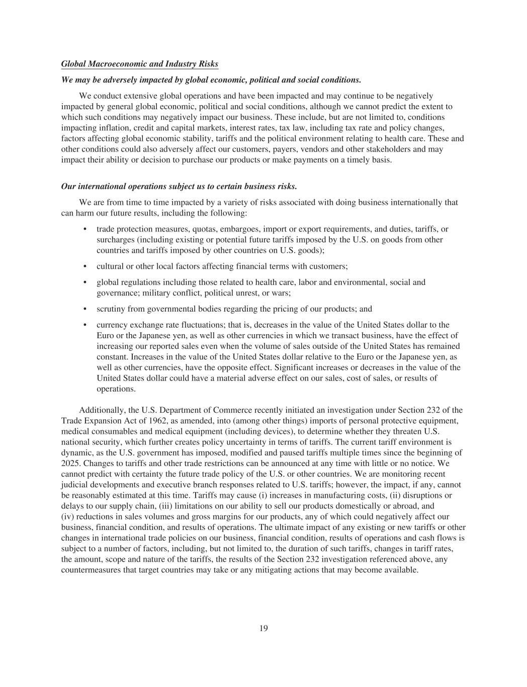 Global Macroeconomic and Industry Risks We may be adversely impacted by global economic, political and social conditions. We conduct extensive global operations and have been impacted and may continue to be negatively impacted by general global economic, political and social conditions, although we cannot predict the extent to which such conditions may negatively impact our business. These include, but are not limited to, conditions impacting inflation, credit and capital markets, interest rates, tax law, including tax rate and policy changes, factors affecting global economic stability, tariffs and the political environment relating to health care. These and other conditions could also adversely affect our customers, payers, vendors and other stakeholders and may impact their ability or decision to purchase our products or make payments on a timely basis. Our international operations subject us to certain business risks. We are from time to time impacted by a variety of risks associated with doing business internationally that can harm our future results, including the following: • trade protection measures, quotas, embargoes, import or export requirements, and duties, tariffs, or surcharges (including existing or potential future tariffs imposed by the U.S. on goods from other countries and tariffs imposed by other countries on U.S. goods); • cultural or other local factors affecting financial terms with customers; • global regulations including those related to health care, labor and environmental, social and governance; military conflict, political unrest, or wars; • scrutiny from governmental bodies regarding the pricing of our products; and • currency exchange rate fluctuations; that is, decreases in the value of the United States dollar to the Euro or the Japanese yen, as well as other currencies in which we transact business, have the effect of increasing our reported sales even when the volume of sales outside of the United States has remained constant. Increases in the value of the United States dollar relative to the Euro or the Japanese yen, as well as other currencies, have the opposite effect. Significant increases or decreases in the value of the United States dollar could have a material adverse effect on our sales, cost of sales, or results of operations. Additionally, the U.S. Department of Commerce recently initiated an investigation under Section 232 of the Trade Expansion Act of 1962, as amended, into (among other things) imports of personal protective equipment, medical consumables and medical equipment (including devices), to determine whether they threaten U.S. national security, which further creates policy uncertainty in terms of tariffs. The current tariff environment is dynamic, as the U.S. government has imposed, modified and paused tariffs multiple times since the beginning of 2025. Changes to tariffs and other trade restrictions can be announced at any time with little or no notice. We cannot predict with certainty the future trade policy of the U.S. or other countries. We are monitoring recent judicial developments and executive branch responses related to U.S. tariffs; however, the impact, if any, cannot be reasonably estimated at this time. Tariffs may cause (i) increases in manufacturing costs, (ii) disruptions or delays to our supply chain, (iii) limitations on our ability to sell our products domestically or abroad, and (iv) reductions in sales volumes and gross margins for our products, any of which could negatively affect our business, financial condition, and results of operations. The ultimate impact of any existing or new tariffs or other changes in international trade policies on our business, financial condition, results of operations and cash flows is subject to a number of factors, including, but not limited to, the duration of such tariffs, changes in tariff rates, the amount, scope and nature of the tariffs, the results of the Section 232 investigation referenced above, any countermeasures that target countries may take or any mitigating actions that may become available. 19