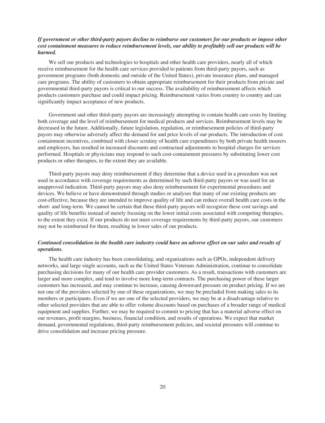 If government or other third-party payors decline to reimburse our customers for our products or impose other cost containment measures to reduce reimbursement levels, our ability to profitably sell our products will be harmed. We sell our products and technologies to hospitals and other health care providers, nearly all of which receive reimbursement for the health care services provided to patients from third-party payors, such as government programs (both domestic and outside of the United States), private insurance plans, and managed care programs. The ability of customers to obtain appropriate reimbursement for their products from private and governmental third-party payors is critical to our success. The availability of reimbursement affects which products customers purchase and could impact pricing. Reimbursement varies from country to country and can significantly impact acceptance of new products. Government and other third-party payors are increasingly attempting to contain health care costs by limiting both coverage and the level of reimbursement for medical products and services. Reimbursement levels may be decreased in the future. Additionally, future legislation, regulation, or reimbursement policies of third-party payors may otherwise adversely affect the demand for and price levels of our products. The introduction of cost containment incentives, combined with closer scrutiny of health care expenditures by both private health insurers and employers, has resulted in increased discounts and contractual adjustments to hospital charges for services performed. Hospitals or physicians may respond to such cost-containment pressures by substituting lower cost products or other therapies, to the extent they are available. Third-party payors may deny reimbursement if they determine that a device used in a procedure was not used in accordance with coverage requirements as determined by such third-party payors or was used for an unapproved indication. Third-party payors may also deny reimbursement for experimental procedures and devices. We believe or have demonstrated through studies or analyses that many of our existing products are cost-effective, because they are intended to improve quality of life and can reduce overall health care costs in the short- and long-term. We cannot be certain that these third-party payors will recognize these cost savings and quality of life benefits instead of merely focusing on the lower initial costs associated with competing therapies, to the extent they exist. If our products do not meet coverage requirements by third-party payors, our customers may not be reimbursed for them, resulting in lower sales of our products. Continued consolidation in the health care industry could have an adverse effect on our sales and results of operations. The health care industry has been consolidating, and organizations such as GPOs, independent delivery networks, and large single accounts, such as the United States Veterans Administration, continue to consolidate purchasing decisions for many of our health care provider customers. As a result, transactions with customers are larger and more complex, and tend to involve more long-term contracts. The purchasing power of these larger customers has increased, and may continue to increase, causing downward pressure on product pricing. If we are not one of the providers selected by one of these organizations, we may be precluded from making sales to its members or participants. Even if we are one of the selected providers, we may be at a disadvantage relative to other selected providers that are able to offer volume discounts based on purchases of a broader range of medical equipment and supplies. Further, we may be required to commit to pricing that has a material adverse effect on our revenues, profit margins, business, financial condition, and results of operations. We expect that market demand, governmental regulations, third-party reimbursement policies, and societal pressures will continue to drive consolidation and increase pricing pressure. 20