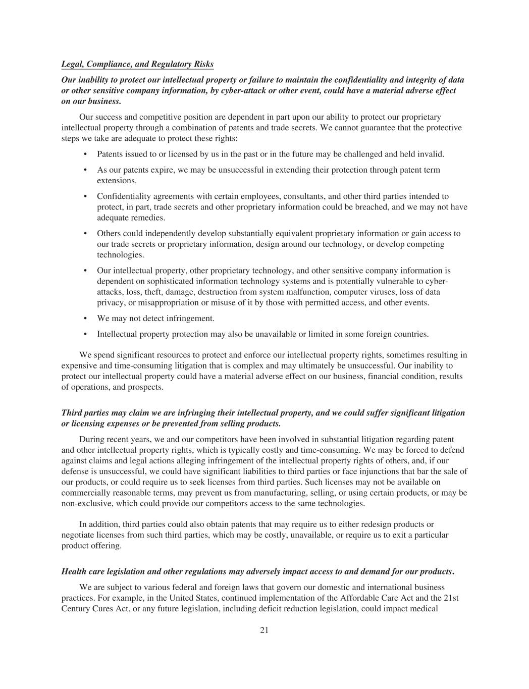 Legal, Compliance, and Regulatory Risks Our inability to protect our intellectual property or failure to maintain the confidentiality and integrity of data or other sensitive company information, by cyber-attack or other event, could have a material adverse effect on our business. Our success and competitive position are dependent in part upon our ability to protect our proprietary intellectual property through a combination of patents and trade secrets. We cannot guarantee that the protective steps we take are adequate to protect these rights: • Patents issued to or licensed by us in the past or in the future may be challenged and held invalid. • As our patents expire, we may be unsuccessful in extending their protection through patent term extensions. • Confidentiality agreements with certain employees, consultants, and other third parties intended to protect, in part, trade secrets and other proprietary information could be breached, and we may not have adequate remedies. • Others could independently develop substantially equivalent proprietary information or gain access to our trade secrets or proprietary information, design around our technology, or develop competing technologies. • Our intellectual property, other proprietary technology, and other sensitive company information is dependent on sophisticated information technology systems and is potentially vulnerable to cyber- attacks, loss, theft, damage, destruction from system malfunction, computer viruses, loss of data privacy, or misappropriation or misuse of it by those with permitted access, and other events. • We may not detect infringement. • Intellectual property protection may also be unavailable or limited in some foreign countries. We spend significant resources to protect and enforce our intellectual property rights, sometimes resulting in expensive and time-consuming litigation that is complex and may ultimately be unsuccessful. Our inability to protect our intellectual property could have a material adverse effect on our business, financial condition, results of operations, and prospects. Third parties may claim we are infringing their intellectual property, and we could suffer significant litigation or licensing expenses or be prevented from selling products. During recent years, we and our competitors have been involved in substantial litigation regarding patent and other intellectual property rights, which is typically costly and time-consuming. We may be forced to defend against claims and legal actions alleging infringement of the intellectual property rights of others, and, if our defense is unsuccessful, we could have significant liabilities to third parties or face injunctions that bar the sale of our products, or could require us to seek licenses from third parties. Such licenses may not be available on commercially reasonable terms, may prevent us from manufacturing, selling, or using certain products, or may be non-exclusive, which could provide our competitors access to the same technologies. In addition, third parties could also obtain patents that may require us to either redesign products or negotiate licenses from such third parties, which may be costly, unavailable, or require us to exit a particular product offering. Health care legislation and other regulations may adversely impact access to and demand for our products. We are subject to various federal and foreign laws that govern our domestic and international business practices. For example, in the United States, continued implementation of the Affordable Care Act and the 21st Century Cures Act, or any future legislation, including deficit reduction legislation, could impact medical 21