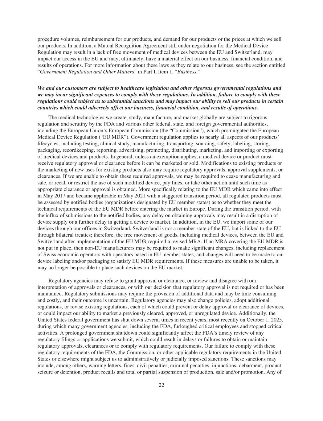 procedure volumes, reimbursement for our products, and demand for our products or the prices at which we sell our products. In addition, a Mutual Recognition Agreement still under negotiation for the Medical Device Regulation may result in a lack of free movement of medical devices between the EU and Switzerland, may impact our access in the EU and may, ultimately, have a material effect on our business, financial condition, and results of operations. For more information about these laws as they relate to our business, see the section entitled “Government Regulation and Other Matters” in Part I, Item 1, “Business.” We and our customers are subject to healthcare legislation and other rigorous governmental regulations and we may incur significant expenses to comply with these regulations. In addition, failure to comply with these regulations could subject us to substantial sanctions and may impact our ability to sell our products in certain countries which could adversely affect our business, financial condition, and results of operations. The medical technologies we create, study, manufacture, and market globally are subject to rigorous regulation and scrutiny by the FDA and various other federal, state, and foreign governmental authorities, including the European Union’s European Commission (the “Commission”), which promulgated the European Medical Device Regulation (“EU MDR”). Government regulation applies to nearly all aspects of our products’ lifecycles, including testing, clinical study, manufacturing, transporting, sourcing, safety, labeling, storing, packaging, recordkeeping, reporting, advertising, promoting, distributing, marketing, and importing or exporting of medical devices and products. In general, unless an exemption applies, a medical device or product must receive regulatory approval or clearance before it can be marketed or sold. Modifications to existing products or the marketing of new uses for existing products also may require regulatory approvals, approval supplements, or clearances. If we are unable to obtain these required approvals, we may be required to cease manufacturing and sale, or recall or restrict the use of such modified device, pay fines, or take other action until such time as appropriate clearance or approval is obtained. More specifically relating to the EU MDR which came into effect in May 2017 and became applicable in May 2021 with a staggered transition period, all regulated products must be assessed by notified bodies (organizations designated by EU member states) as to whether they meet the technical requirements of the EU MDR before entering the market in Europe. During the transition period, with the influx of submissions to the notified bodies, any delay on obtaining approvals may result in a disruption of device supply or a further delay in getting a device to market. In addition, in the EU, we import some of our devices through our offices in Switzerland. Switzerland is not a member state of the EU, but is linked to the EU through bilateral treaties; therefore, the free movement of goods, including medical devices, between the EU and Switzerland after implementation of the EU MDR required a revised MRA. If an MRA covering the EU MDR is not put in place, then non-EU manufacturers may be required to make significant changes, including replacement of Swiss economic operators with operators based in EU member states, and changes will need to be made to our device labeling and/or packaging to satisfy EU MDR requirements. If these measures are unable to be taken, it may no longer be possible to place such devices on the EU market. Regulatory agencies may refuse to grant approval or clearance, or review and disagree with our interpretation of approvals or clearances, or with our decision that regulatory approval is not required or has been maintained. Regulatory submissions may require the provision of additional data and may be time consuming and costly, and their outcome is uncertain. Regulatory agencies may also change policies, adopt additional regulations, or revise existing regulations, each of which could prevent or delay approval or clearance of devices, or could impact our ability to market a previously cleared, approved, or unregulated device. Additionally, the United States federal government has shut down several times in recent years, most recently on October 1, 2025, during which many government agencies, including the FDA, furloughed critical employees and stopped critical activities. A prolonged government shutdown could significantly affect the FDA’s timely review of any regulatory filings or applications we submit, which could result in delays or failures to obtain or maintain regulatory approvals, clearances or to comply with regulatory requirements. Our failure to comply with these regulatory requirements of the FDA, the Commission, or other applicable regulatory requirements in the United States or elsewhere might subject us to administratively or judicially imposed sanctions. These sanctions may include, among others, warning letters, fines, civil penalties, criminal penalties, injunctions, debarment, product seizure or detention, product recalls and total or partial suspension of production, sale and/or promotion. Any of 22