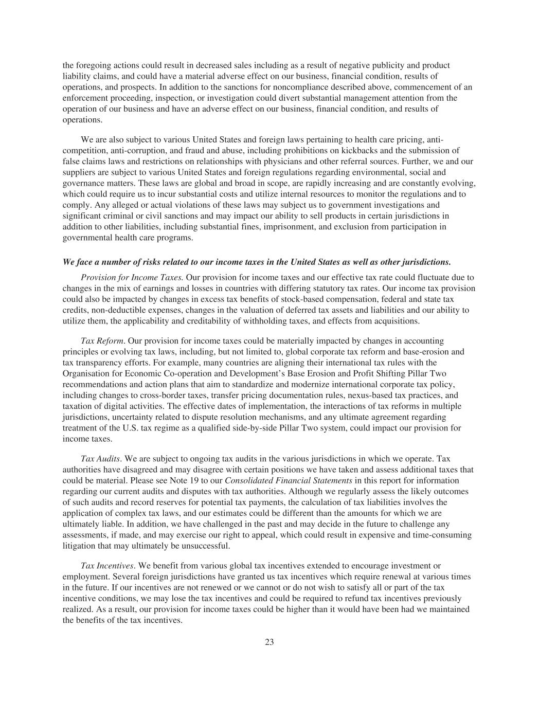 the foregoing actions could result in decreased sales including as a result of negative publicity and product liability claims, and could have a material adverse effect on our business, financial condition, results of operations, and prospects. In addition to the sanctions for noncompliance described above, commencement of an enforcement proceeding, inspection, or investigation could divert substantial management attention from the operation of our business and have an adverse effect on our business, financial condition, and results of operations. We are also subject to various United States and foreign laws pertaining to health care pricing, anti- competition, anti-corruption, and fraud and abuse, including prohibitions on kickbacks and the submission of false claims laws and restrictions on relationships with physicians and other referral sources. Further, we and our suppliers are subject to various United States and foreign regulations regarding environmental, social and governance matters. These laws are global and broad in scope, are rapidly increasing and are constantly evolving, which could require us to incur substantial costs and utilize internal resources to monitor the regulations and to comply. Any alleged or actual violations of these laws may subject us to government investigations and significant criminal or civil sanctions and may impact our ability to sell products in certain jurisdictions in addition to other liabilities, including substantial fines, imprisonment, and exclusion from participation in governmental health care programs. We face a number of risks related to our income taxes in the United States as well as other jurisdictions. Provision for Income Taxes. Our provision for income taxes and our effective tax rate could fluctuate due to changes in the mix of earnings and losses in countries with differing statutory tax rates. Our income tax provision could also be impacted by changes in excess tax benefits of stock-based compensation, federal and state tax credits, non-deductible expenses, changes in the valuation of deferred tax assets and liabilities and our ability to utilize them, the applicability and creditability of withholding taxes, and effects from acquisitions. Tax Reform. Our provision for income taxes could be materially impacted by changes in accounting principles or evolving tax laws, including, but not limited to, global corporate tax reform and base-erosion and tax transparency efforts. For example, many countries are aligning their international tax rules with the Organisation for Economic Co-operation and Development’s Base Erosion and Profit Shifting Pillar Two recommendations and action plans that aim to standardize and modernize international corporate tax policy, including changes to cross-border taxes, transfer pricing documentation rules, nexus-based tax practices, and taxation of digital activities. The effective dates of implementation, the interactions of tax reforms in multiple jurisdictions, uncertainty related to dispute resolution mechanisms, and any ultimate agreement regarding treatment of the U.S. tax regime as a qualified side-by-side Pillar Two system, could impact our provision for income taxes. Tax Audits. We are subject to ongoing tax audits in the various jurisdictions in which we operate. Tax authorities have disagreed and may disagree with certain positions we have taken and assess additional taxes that could be material. Please see Note 19 to our Consolidated Financial Statements in this report for information regarding our current audits and disputes with tax authorities. Although we regularly assess the likely outcomes of such audits and record reserves for potential tax payments, the calculation of tax liabilities involves the application of complex tax laws, and our estimates could be different than the amounts for which we are ultimately liable. In addition, we have challenged in the past and may decide in the future to challenge any assessments, if made, and may exercise our right to appeal, which could result in expensive and time-consuming litigation that may ultimately be unsuccessful. Tax Incentives. We benefit from various global tax incentives extended to encourage investment or employment. Several foreign jurisdictions have granted us tax incentives which require renewal at various times in the future. If our incentives are not renewed or we cannot or do not wish to satisfy all or part of the tax incentive conditions, we may lose the tax incentives and could be required to refund tax incentives previously realized. As a result, our provision for income taxes could be higher than it would have been had we maintained the benefits of the tax incentives. 23