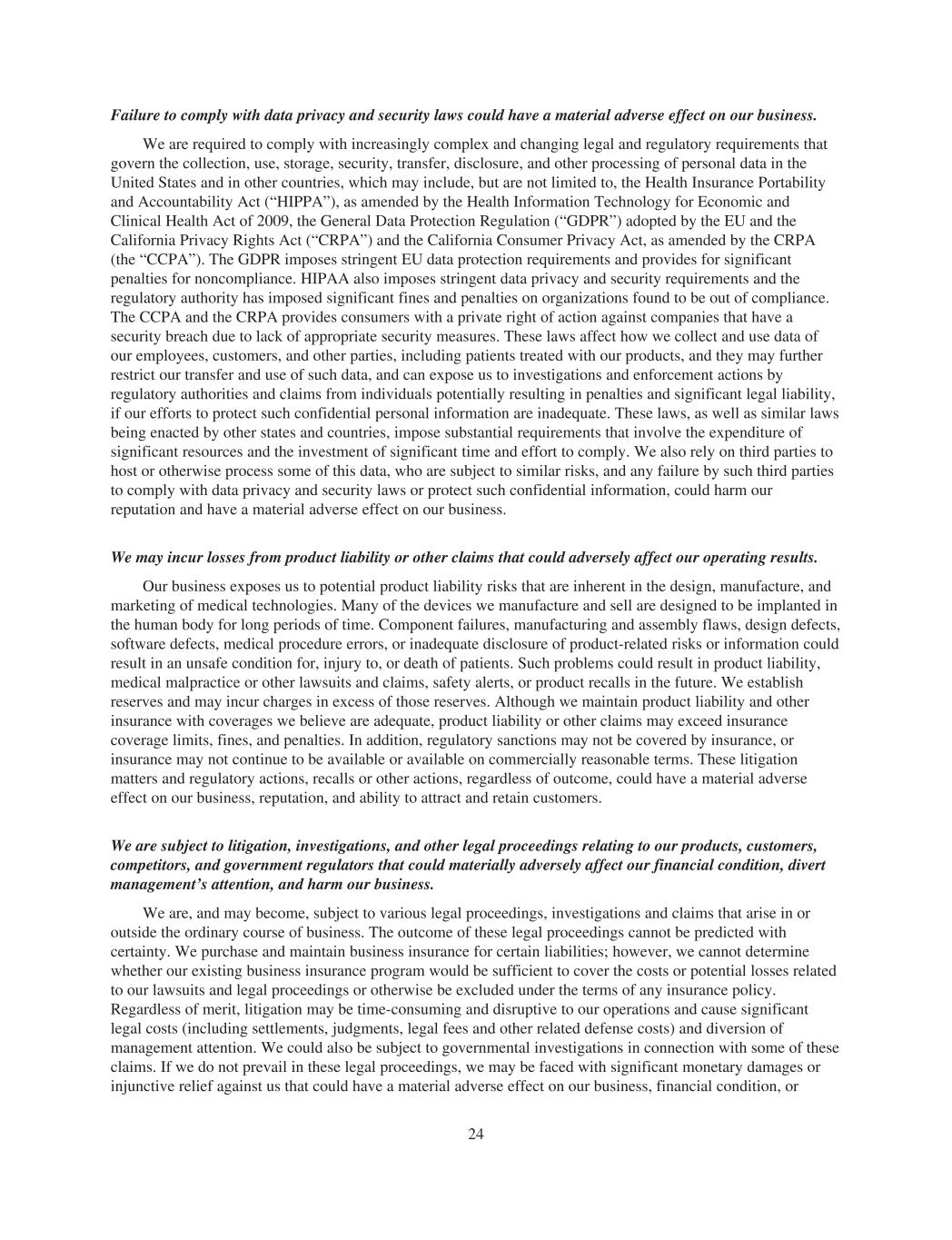 Failure to comply with data privacy and security laws could have a material adverse effect on our business. We are required to comply with increasingly complex and changing legal and regulatory requirements that govern the collection, use, storage, security, transfer, disclosure, and other processing of personal data in the United States and in other countries, which may include, but are not limited to, the Health Insurance Portability and Accountability Act (“HIPPA”), as amended by the Health Information Technology for Economic and Clinical Health Act of 2009, the General Data Protection Regulation (“GDPR”) adopted by the EU and the California Privacy Rights Act (“CRPA”) and the California Consumer Privacy Act, as amended by the CRPA (the “CCPA”). The GDPR imposes stringent EU data protection requirements and provides for significant penalties for noncompliance. HIPAA also imposes stringent data privacy and security requirements and the regulatory authority has imposed significant fines and penalties on organizations found to be out of compliance. The CCPA and the CRPA provides consumers with a private right of action against companies that have a security breach due to lack of appropriate security measures. These laws affect how we collect and use data of our employees, customers, and other parties, including patients treated with our products, and they may further restrict our transfer and use of such data, and can expose us to investigations and enforcement actions by regulatory authorities and claims from individuals potentially resulting in penalties and significant legal liability, if our efforts to protect such confidential personal information are inadequate. These laws, as well as similar laws being enacted by other states and countries, impose substantial requirements that involve the expenditure of significant resources and the investment of significant time and effort to comply. We also rely on third parties to host or otherwise process some of this data, who are subject to similar risks, and any failure by such third parties to comply with data privacy and security laws or protect such confidential information, could harm our reputation and have a material adverse effect on our business. We may incur losses from product liability or other claims that could adversely affect our operating results. Our business exposes us to potential product liability risks that are inherent in the design, manufacture, and marketing of medical technologies. Many of the devices we manufacture and sell are designed to be implanted in the human body for long periods of time. Component failures, manufacturing and assembly flaws, design defects, software defects, medical procedure errors, or inadequate disclosure of product-related risks or information could result in an unsafe condition for, injury to, or death of patients. Such problems could result in product liability, medical malpractice or other lawsuits and claims, safety alerts, or product recalls in the future. We establish reserves and may incur charges in excess of those reserves. Although we maintain product liability and other insurance with coverages we believe are adequate, product liability or other claims may exceed insurance coverage limits, fines, and penalties. In addition, regulatory sanctions may not be covered by insurance, or insurance may not continue to be available or available on commercially reasonable terms. These litigation matters and regulatory actions, recalls or other actions, regardless of outcome, could have a material adverse effect on our business, reputation, and ability to attract and retain customers. We are subject to litigation, investigations, and other legal proceedings relating to our products, customers, competitors, and government regulators that could materially adversely affect our financial condition, divert management’s attention, and harm our business. We are, and may become, subject to various legal proceedings, investigations and claims that arise in or outside the ordinary course of business. The outcome of these legal proceedings cannot be predicted with certainty. We purchase and maintain business insurance for certain liabilities; however, we cannot determine whether our existing business insurance program would be sufficient to cover the costs or potential losses related to our lawsuits and legal proceedings or otherwise be excluded under the terms of any insurance policy. Regardless of merit, litigation may be time-consuming and disruptive to our operations and cause significant legal costs (including settlements, judgments, legal fees and other related defense costs) and diversion of management attention. We could also be subject to governmental investigations in connection with some of these claims. If we do not prevail in these legal proceedings, we may be faced with significant monetary damages or injunctive relief against us that could have a material adverse effect on our business, financial condition, or 24