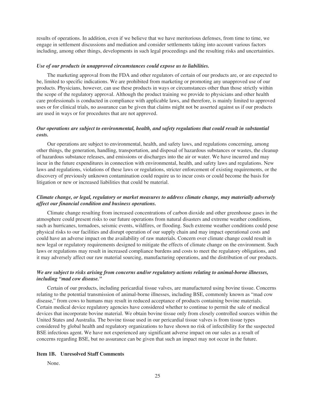 results of operations. In addition, even if we believe that we have meritorious defenses, from time to time, we engage in settlement discussions and mediation and consider settlements taking into account various factors including, among other things, developments in such legal proceedings and the resulting risks and uncertainties. Use of our products in unapproved circumstances could expose us to liabilities. The marketing approval from the FDA and other regulators of certain of our products are, or are expected to be, limited to specific indications. We are prohibited from marketing or promoting any unapproved use of our products. Physicians, however, can use these products in ways or circumstances other than those strictly within the scope of the regulatory approval. Although the product training we provide to physicians and other health care professionals is conducted in compliance with applicable laws, and therefore, is mainly limited to approved uses or for clinical trials, no assurance can be given that claims might not be asserted against us if our products are used in ways or for procedures that are not approved. Our operations are subject to environmental, health, and safety regulations that could result in substantial costs. Our operations are subject to environmental, health, and safety laws, and regulations concerning, among other things, the generation, handling, transportation, and disposal of hazardous substances or wastes, the cleanup of hazardous substance releases, and emissions or discharges into the air or water. We have incurred and may incur in the future expenditures in connection with environmental, health, and safety laws and regulations. New laws and regulations, violations of these laws or regulations, stricter enforcement of existing requirements, or the discovery of previously unknown contamination could require us to incur costs or could become the basis for litigation or new or increased liabilities that could be material. Climate change, or legal, regulatory or market measures to address climate change, may materially adversely affect our financial condition and business operations. Climate change resulting from increased concentrations of carbon dioxide and other greenhouse gases in the atmosphere could present risks to our future operations from natural disasters and extreme weather conditions, such as hurricanes, tornadoes, seismic events, wildfires, or flooding. Such extreme weather conditions could pose physical risks to our facilities and disrupt operation of our supply chain and may impact operational costs and could have an adverse impact on the availability of raw materials. Concern over climate change could result in new legal or regulatory requirements designed to mitigate the effects of climate change on the environment. Such laws or regulations may result in increased compliance burdens and costs to meet the regulatory obligations, and it may adversely affect our raw material sourcing, manufacturing operations, and the distribution of our products. We are subject to risks arising from concerns and/or regulatory actions relating to animal-borne illnesses, including “mad cow disease.” Certain of our products, including pericardial tissue valves, are manufactured using bovine tissue. Concerns relating to the potential transmission of animal-borne illnesses, including BSE, commonly known as “mad cow disease,” from cows to humans may result in reduced acceptance of products containing bovine materials. Certain medical device regulatory agencies have considered whether to continue to permit the sale of medical devices that incorporate bovine material. We obtain bovine tissue only from closely controlled sources within the United States and Australia. The bovine tissue used in our pericardial tissue valves is from tissue types considered by global health and regulatory organizations to have shown no risk of infectibility for the suspected BSE infectious agent. We have not experienced any significant adverse impact on our sales as a result of concerns regarding BSE, but no assurance can be given that such an impact may not occur in the future. Item 1B. Unresolved Staff Comments None. 25