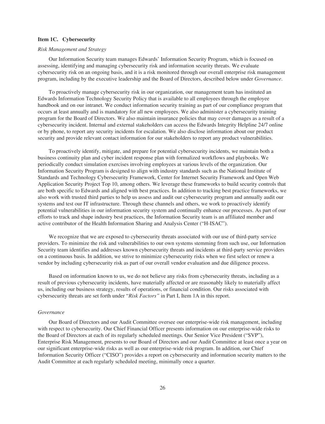 Item 1C. Cybersecurity Risk Management and Strategy Our Information Security team manages Edwards’ Information Security Program, which is focused on assessing, identifying and managing cybersecurity risk and information security threats. We evaluate cybersecurity risk on an ongoing basis, and it is a risk monitored through our overall enterprise risk management program, including by the executive leadership and the Board of Directors, described below under Governance. To proactively manage cybersecurity risk in our organization, our management team has instituted an Edwards Information Technology Security Policy that is available to all employees through the employee handbook and on our intranet. We conduct information security training as part of our compliance program that occurs at least annually and is mandatory for all new employees. We also administer a cybersecurity training program for the Board of Directors. We also maintain insurance policies that may cover damages as a result of a cybersecurity incident. Internal and external stakeholders can access the Edwards Integrity Helpline 24/7 online or by phone, to report any security incidents for escalation. We also disclose information about our product security and provide relevant contact information for our stakeholders to report any product vulnerabilities. To proactively identify, mitigate, and prepare for potential cybersecurity incidents, we maintain both a business continuity plan and cyber incident response plan with formalized workflows and playbooks. We periodically conduct simulation exercises involving employees at various levels of the organization. Our Information Security Program is designed to align with industry standards such as the National Institute of Standards and Technology Cybersecurity Framework, Center for Internet Security Framework and Open Web Application Security Project Top 10, among others. We leverage these frameworks to build security controls that are both specific to Edwards and aligned with best practices. In addition to tracking best practice frameworks, we also work with trusted third parties to help us assess and audit our cybersecurity program and annually audit our systems and test our IT infrastructure. Through these channels and others, we work to proactively identify potential vulnerabilities in our information security system and continually enhance our processes. As part of our efforts to track and shape industry best practices, the Information Security team is an affiliated member and active contributor of the Health Information Sharing and Analysis Center (“H-ISAC”). We recognize that we are exposed to cybersecurity threats associated with our use of third-party service providers. To minimize the risk and vulnerabilities to our own systems stemming from such use, our Information Security team identifies and addresses known cybersecurity threats and incidents at third-party service providers on a continuous basis. In addition, we strive to minimize cybersecurity risks when we first select or renew a vendor by including cybersecurity risk as part of our overall vendor evaluation and due diligence process. Based on information known to us, we do not believe any risks from cybersecurity threats, including as a result of previous cybersecurity incidents, have materially affected or are reasonably likely to materially affect us, including our business strategy, results of operations, or financial condition. Our risks associated with cybersecurity threats are set forth under “Risk Factors” in Part I, Item 1A in this report. Governance Our Board of Directors and our Audit Committee oversee our enterprise-wide risk management, including with respect to cybersecurity. Our Chief Financial Officer presents information on our enterprise-wide risks to the Board of Directors at each of its regularly scheduled meetings. Our Senior Vice President (“SVP”), Enterprise Risk Management, presents to our Board of Directors and our Audit Committee at least once a year on our significant enterprise-wide risks as well as our enterprise-wide risk program. In addition, our Chief Information Security Officer (“CISO”) provides a report on cybersecurity and information security matters to the Audit Committee at each regularly scheduled meeting, minimally once a quarter. 26