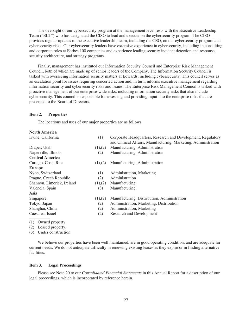 The oversight of our cybersecurity program at the management level rests with the Executive Leadership Team (“ELT”) who has designated the CISO to lead and execute on the cybersecurity program. The CISO provides regular updates to the executive leadership team, including the CEO, on our cybersecurity program and cybersecurity risks. Our cybersecurity leaders have extensive experience in cybersecurity, including in consulting and corporate roles at Forbes 100 companies and experience leading security incident detection and response, security architecture, and strategy programs. Finally, management has instituted our Information Security Council and Enterprise Risk Management Council, both of which are made up of senior leaders of the Company. The Information Security Council is tasked with overseeing information security matters at Edwards, including cybersecurity. This council serves as an escalation point for issues requiring concerted action and, in turn, informs executive management regarding information security and cybersecurity risks and issues. The Enterprise Risk Management Council is tasked with proactive management of our enterprise-wide risks, including information security risks that also include cybersecurity. This council is responsible for assessing and providing input into the enterprise risks that are presented to the Board of Directors. Item 2. Properties The locations and uses of our major properties are as follows: North America Irvine, California (1) Corporate Headquarters, Research and Development, Regulatory and Clinical Affairs, Manufacturing, Marketing, Administration Draper, Utah (1),(2) Manufacturing, Administration Naperville, Illinois (2) Manufacturing, Administration Central America Cartago, Costa Rica (1),(2) Manufacturing, Administration Europe Nyon, Switzerland (1) Administration, Marketing Prague, Czech Republic (2) Administration Shannon, Limerick, Ireland (1),(2) Manufacturing Valencia, Spain (3) Manufacturing Asia Singapore (1),(2) Manufacturing, Distribution, Administration Tokyo, Japan (2) Administration, Marketing, Distribution Shanghai, China (2) Administration, Marketing Caesarea, Israel (2) Research and Development (1) Owned property. (2) Leased property. (3) Under construction. We believe our properties have been well maintained, are in good operating condition, and are adequate for current needs. We do not anticipate difficulty in renewing existing leases as they expire or in finding alternative facilities. Item 3. Legal Proceedings Please see Note 20 to our Consolidated Financial Statements in this Annual Report for a description of our legal proceedings, which is incorporated by reference herein. 27