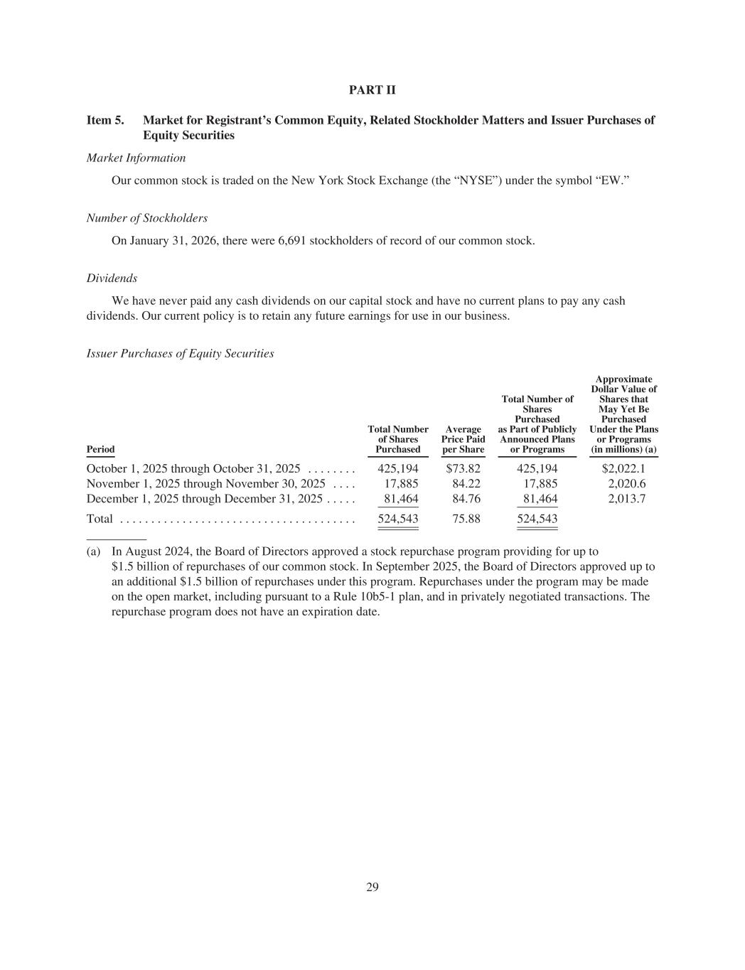 PART II Item 5. Market for Registrant’s Common Equity, Related Stockholder Matters and Issuer Purchases of Equity Securities Market Information Our common stock is traded on the New York Stock Exchange (the “NYSE”) under the symbol “EW.” Number of Stockholders On January 31, 2026, there were 6,691 stockholders of record of our common stock. Dividends We have never paid any cash dividends on our capital stock and have no current plans to pay any cash dividends. Our current policy is to retain any future earnings for use in our business. Issuer Purchases of Equity Securities Period Total Number of Shares Purchased Average Price Paid per Share Total Number of Shares Purchased as Part of Publicly Announced Plans or Programs Approximate Dollar Value of Shares that May Yet Be Purchased Under the Plans or Programs (in millions) (a) October 1, 2025 through October 31, 2025 . . . . . . . . 425,194 $73.82 425,194 $2,022.1 November 1, 2025 through November 30, 2025 . . . . 17,885 84.22 17,885 2,020.6 December 1, 2025 through December 31, 2025 . . . . . 81,464 84.76 81,464 2,013.7 Total . . . . . . . . . . . . . . . . . . . . . . . . . . . . . . . . . . . . . . 524,543 75.88 524,543 (a) In August 2024, the Board of Directors approved a stock repurchase program providing for up to $1.5 billion of repurchases of our common stock. In September 2025, the Board of Directors approved up to an additional $1.5 billion of repurchases under this program. Repurchases under the program may be made on the open market, including pursuant to a Rule 10b5-1 plan, and in privately negotiated transactions. The repurchase program does not have an expiration date. 29