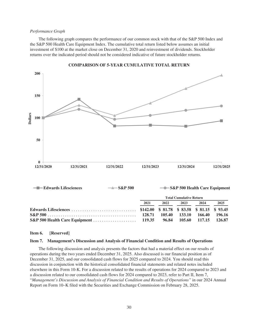 Performance Graph The following graph compares the performance of our common stock with that of the S&P 500 Index and the S&P 500 Health Care Equipment Index. The cumulative total return listed below assumes an initial investment of $100 at the market close on December 31, 2020 and reinvestment of dividends. Stockholder returns over the indicated period should not be considered indicative of future stockholder returns. COMPARISON OF 5-YEAR CUMULATIVE TOTAL RETURN 0 50 100 150 200 12/31/202512/31/202412/31/2020 12/31/2021 12/31/2022 12/31/2023 Edwards Lifesciences S&P 500 D ol la rs S&P 500 Health Care Equipment Total Cumulative Return 2021 2022 2023 2024 2025 Edwards Lifesciences . . . . . . . . . . . . . . . . . . . . . . . . . . . . . . $142.00 $ 81.78 $ 83.58 $ 81.15 $ 93.45 S&P 500 . . . . . . . . . . . . . . . . . . . . . . . . . . . . . . . . . . . . . . . . . 128.71 105.40 133.10 166.40 196.16 S&P 500 Health Care Equipment . . . . . . . . . . . . . . . . . . . . 119.35 96.84 105.60 117.15 126.87 Item 6. [Reserved] Item 7. Management’s Discussion and Analysis of Financial Condition and Results of Operations The following discussion and analysis presents the factors that had a material effect on our results of operations during the two years ended December 31, 2025. Also discussed is our financial position as of December 31, 2025, and our consolidated cash flows for 2025 compared to 2024. You should read this discussion in conjunction with the historical consolidated financial statements and related notes included elsewhere in this Form 10-K. For a discussion related to the results of operations for 2024 compared to 2023 and a discussion related to our consolidated cash flows for 2024 compared to 2023, refer to Part II, Item 7, “Management’s Discussion and Analysis of Financial Condition and Results of Operations” in our 2024 Annual Report on Form 10–K filed with the Securities and Exchange Commission on February 28, 2025. 30