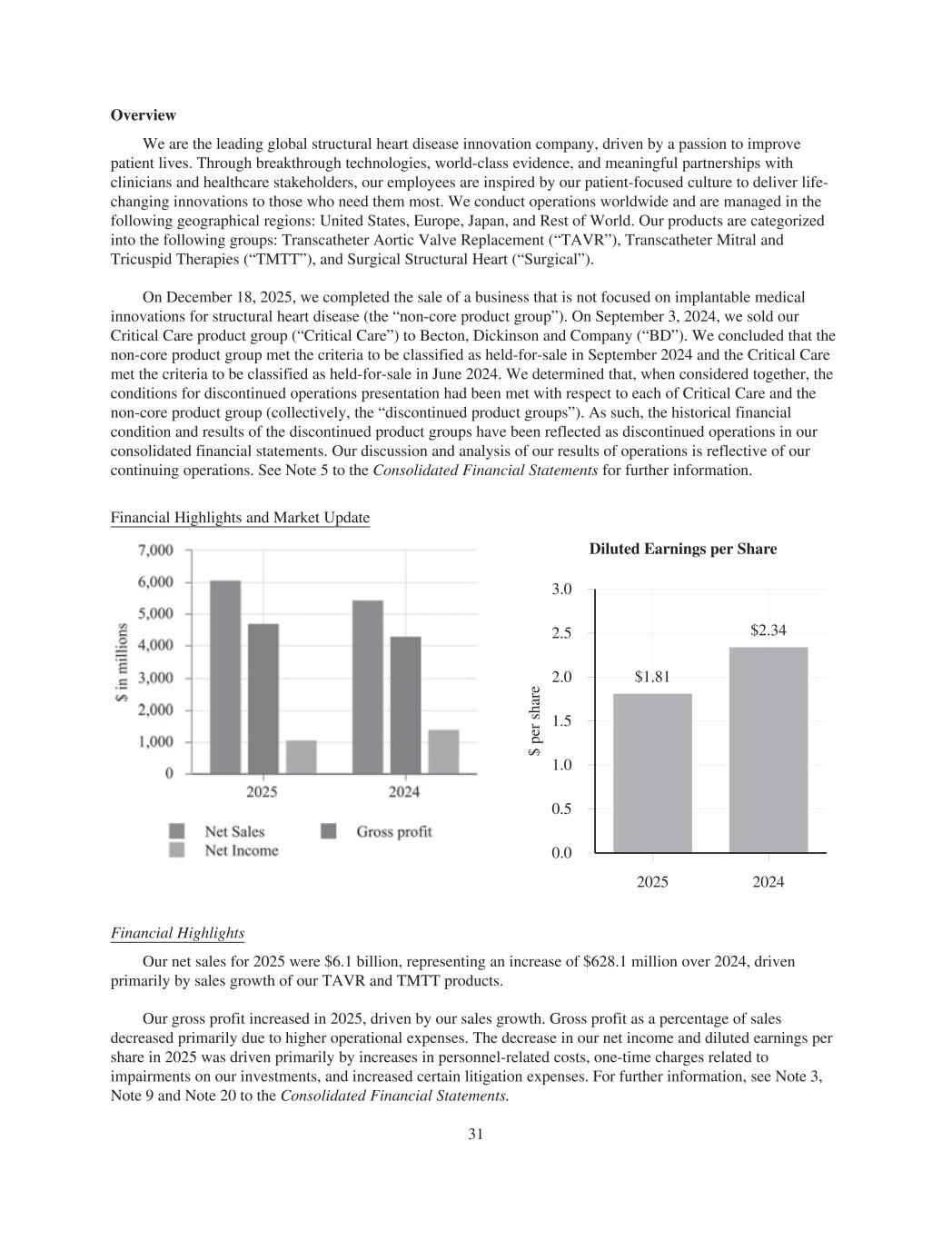 Overview We are the leading global structural heart disease innovation company, driven by a passion to improve patient lives. Through breakthrough technologies, world-class evidence, and meaningful partnerships with clinicians and healthcare stakeholders, our employees are inspired by our patient-focused culture to deliver life- changing innovations to those who need them most. We conduct operations worldwide and are managed in the following geographical regions: United States, Europe, Japan, and Rest of World. Our products are categorized into the following groups: Transcatheter Aortic Valve Replacement (“TAVR”), Transcatheter Mitral and Tricuspid Therapies (“TMTT”), and Surgical Structural Heart (“Surgical”). On December 18, 2025, we completed the sale of a business that is not focused on implantable medical innovations for structural heart disease (the “non-core product group”). On September 3, 2024, we sold our Critical Care product group (“Critical Care”) to Becton, Dickinson and Company (“BD”). We concluded that the non-core product group met the criteria to be classified as held-for-sale in September 2024 and the Critical Care met the criteria to be classified as held-for-sale in June 2024. We determined that, when considered together, the conditions for discontinued operations presentation had been met with respect to each of Critical Care and the non-core product group (collectively, the “discontinued product groups”). As such, the historical financial condition and results of the discontinued product groups have been reflected as discontinued operations in our consolidated financial statements. Our discussion and analysis of our results of operations is reflective of our continuing operations. See Note 5 to the Consolidated Financial Statements for further information. Financial Highlights and Market Update $ pe r sh ar e 0.0 Diluted Earnings per Share 3.0 2.5 2.0 1.5 1.0 0.5 2025 $1.81 2024 $2.34 Financial Highlights Our net sales for 2025 were $6.1 billion, representing an increase of $628.1 million over 2024, driven primarily by sales growth of our TAVR and TMTT products. Our gross profit increased in 2025, driven by our sales growth. Gross profit as a percentage of sales decreased primarily due to higher operational expenses. The decrease in our net income and diluted earnings per share in 2025 was driven primarily by increases in personnel-related costs, one-time charges related to impairments on our investments, and increased certain litigation expenses. For further information, see Note 3, Note 9 and Note 20 to the Consolidated Financial Statements. 31