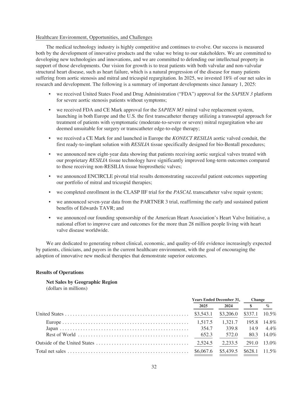 Healthcare Environment, Opportunities, and Challenges The medical technology industry is highly competitive and continues to evolve. Our success is measured both by the development of innovative products and the value we bring to our stakeholders. We are committed to developing new technologies and innovations, and we are committed to defending our intellectual property in support of those developments. Our vision for growth is to treat patients with both valvular and non-valvular structural heart disease, such as heart failure, which is a natural progression of the disease for many patients suffering from aortic stenosis and mitral and tricuspid regurgitation. In 2025, we invested 18% of our net sales in research and development. The following is a summary of important developments since January 1, 2025: • we received United States Food and Drug Administration (“FDA”) approval for the SAPIEN 3 platform for severe aortic stenosis patients without symptoms; • we received FDA and CE Mark approval for the SAPIEN M3 mitral valve replacement system, launching in both Europe and the U.S. the first transcatheter therapy utilizing a transseptal approach for treatment of patients with symptomatic (moderate-to-severe or severe) mitral regurgitation who are deemed unsuitable for surgery or transcatheter edge-to-edge therapy; • we received a CE Mark for and launched in Europe the KONECT RESILIA aortic valved conduit, the first ready-to-implant solution with RESILIA tissue specifically designed for bio-Bentall procedures; • we announced new eight-year data showing that patients receiving aortic surgical valves treated with our proprietary RESILIA tissue technology have significantly improved long-term outcomes compared to those receiving non-RESILIA tissue bioprosthetic valves; • we announced ENCIRCLE pivotal trial results demonstrating successful patient outcomes supporting our portfolio of mitral and tricuspid therapies; • we completed enrollment in the CLASP IIF trial for the PASCAL transcatheter valve repair system; • we announced seven-year data from the PARTNER 3 trial, reaffirming the early and sustained patient benefits of Edwards TAVR; and • we announced our founding sponsorship of the American Heart Association’s Heart Valve Initiative, a national effort to improve care and outcomes for the more than 28 million people living with heart valve disease worldwide. We are dedicated to generating robust clinical, economic, and quality-of-life evidence increasingly expected by patients, clinicians, and payors in the current healthcare environment, with the goal of encouraging the adoption of innovative new medical therapies that demonstrate superior outcomes. Results of Operations Net Sales by Geographic Region (dollars in millions) Years Ended December 31, Change 2025 2024 $ % United States . . . . . . . . . . . . . . . . . . . . . . . . . . . . . . . . . . . . . . . . . . . . . . . . $3,543.1 $3,206.0 $337.1 10.5% Europe . . . . . . . . . . . . . . . . . . . . . . . . . . . . . . . . . . . . . . . . . . . . . . . . . 1,517.5 1,321.7 195.8 14.8% Japan . . . . . . . . . . . . . . . . . . . . . . . . . . . . . . . . . . . . . . . . . . . . . . . . . . 354.7 339.8 14.9 4.4% Rest of World . . . . . . . . . . . . . . . . . . . . . . . . . . . . . . . . . . . . . . . . . . . 652.3 572.0 80.3 14.0% Outside of the United States . . . . . . . . . . . . . . . . . . . . . . . . . . . . . . . . . . . . 2,524.5 2,233.5 291.0 13.0% Total net sales . . . . . . . . . . . . . . . . . . . . . . . . . . . . . . . . . . . . . . . . . . . . . . . $6,067.6 $5,439.5 $628.1 11.5% 32