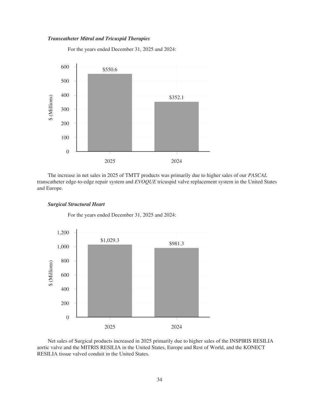 Transcatheter Mitral and Tricuspid Therapies For the years ended December 31, 2025 and 2024: $ (M ill io ns ) 0 2025 2024 600 500 400 300 200 100 $352.1 $550.6 The increase in net sales in 2025 of TMTT products was primarily due to higher sales of our PASCAL transcatheter edge-to-edge repair system and EVOQUE tricuspid valve replacement system in the United States and Europe. Surgical Structural Heart For the years ended December 31, 2025 and 2024: $ (M ill io ns ) 0 2025 2024 1,200 1,000 800 600 400 200 $981.3 $1,029.3 Net sales of Surgical products increased in 2025 primarily due to higher sales of the INSPIRIS RESILIA aortic valve and the MITRIS RESILIA in the United States, Europe and Rest of World, and the KONECT RESILIA tissue valved conduit in the United States. 34