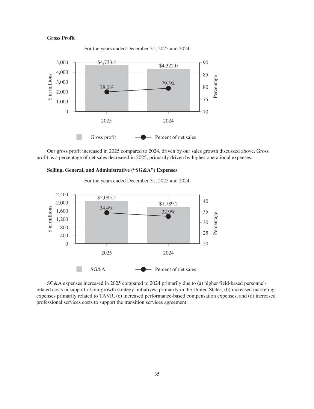 Gross Profit For the years ended December 31, 2025 and 2024: 0 Gross profit Percent of net sales $ in m ill io ns 5,000 4,000 3,000 2,000 1,000 70 75 80 90 85 2024 $4,322.0 2025 $4,733.4 78.0% 79.5% Pe rc en ta ge Our gross profit increased in 2025 compared to 2024, driven by our sales growth discussed above. Gross profit as a percentage of net sales decreased in 2025, primarily driven by higher operational expenses. Selling, General, and Administrative (“SG&A”) Expenses For the years ended December 31, 2025 and 2024: 0 SG&A Percent of net sales $ in m ill io ns Pe rc en ta ge 2025 2,400 2,000 1,600 1,200 800 400 20 25 30 40 35 2024 $2,085.2 34.4% $1,789.2 32.9% SG&A expenses increased in 2025 compared to 2024 primarily due to (a) higher field-based personnel- related costs in support of our growth strategy initiatives, primarily in the United States, (b) increased marketing expenses primarily related to TAVR, (c) increased performance-based compensation expenses, and (d) increased professional services costs to support the transition services agreement. 35