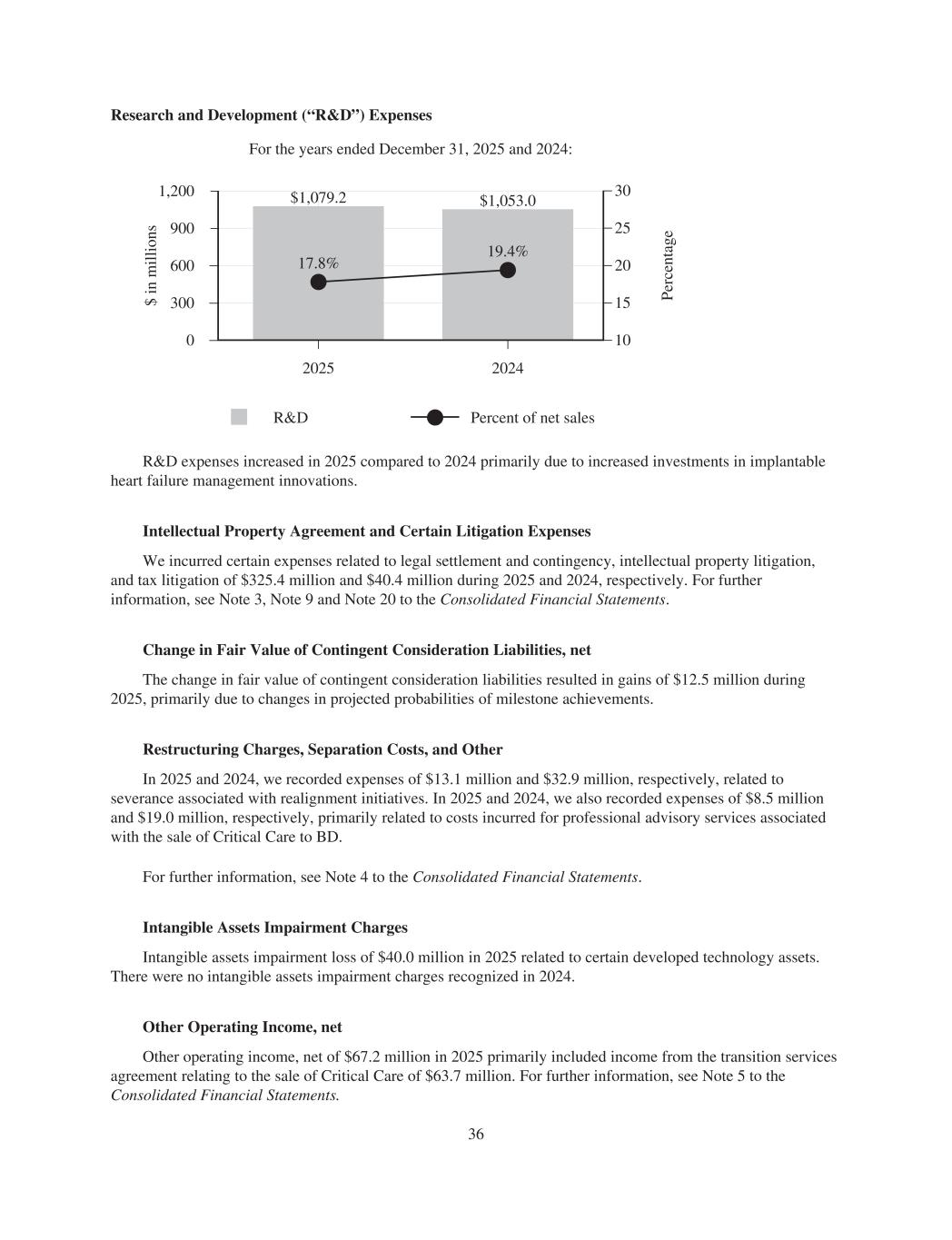 Research and Development (“R&D”) Expenses For the years ended December 31, 2025 and 2024: 30 20 15 10 $ in m ill io ns Pe rc en ta ge 1,200 900 600 300 0 R&D Percent of net sales 25 2025 $1,079.2 17.8% 2024 $1,053.0 19.4% R&D expenses increased in 2025 compared to 2024 primarily due to increased investments in implantable heart failure management innovations. Intellectual Property Agreement and Certain Litigation Expenses We incurred certain expenses related to legal settlement and contingency, intellectual property litigation, and tax litigation of $325.4 million and $40.4 million during 2025 and 2024, respectively. For further information, see Note 3, Note 9 and Note 20 to the Consolidated Financial Statements. Change in Fair Value of Contingent Consideration Liabilities, net The change in fair value of contingent consideration liabilities resulted in gains of $12.5 million during 2025, primarily due to changes in projected probabilities of milestone achievements. Restructuring Charges, Separation Costs, and Other In 2025 and 2024, we recorded expenses of $13.1 million and $32.9 million, respectively, related to severance associated with realignment initiatives. In 2025 and 2024, we also recorded expenses of $8.5 million and $19.0 million, respectively, primarily related to costs incurred for professional advisory services associated with the sale of Critical Care to BD. For further information, see Note 4 to the Consolidated Financial Statements. Intangible Assets Impairment Charges Intangible assets impairment loss of $40.0 million in 2025 related to certain developed technology assets. There were no intangible assets impairment charges recognized in 2024. Other Operating Income, net Other operating income, net of $67.2 million in 2025 primarily included income from the transition services agreement relating to the sale of Critical Care of $63.7 million. For further information, see Note 5 to the Consolidated Financial Statements. 36