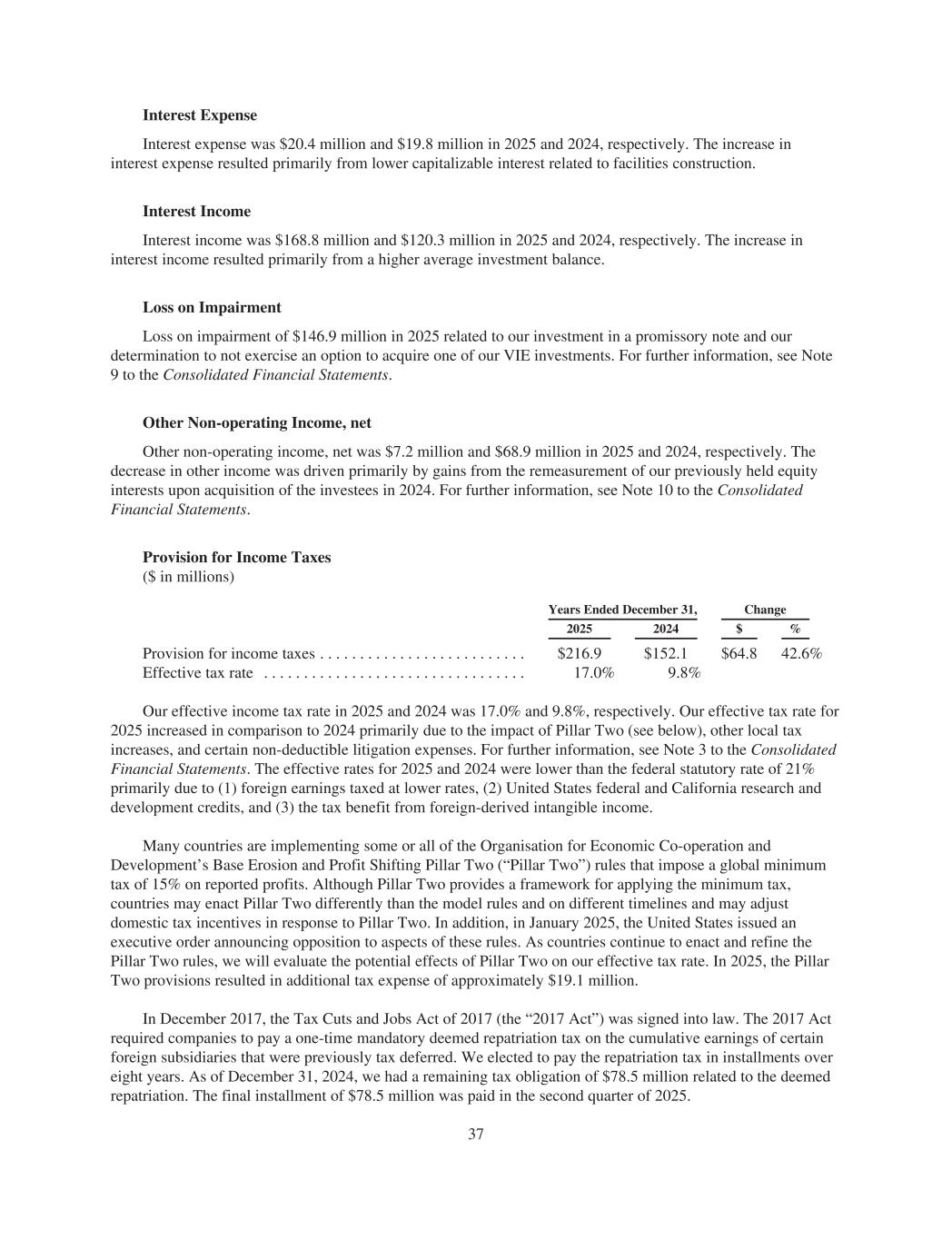 Interest Expense Interest expense was $20.4 million and $19.8 million in 2025 and 2024, respectively. The increase in interest expense resulted primarily from lower capitalizable interest related to facilities construction. Interest Income Interest income was $168.8 million and $120.3 million in 2025 and 2024, respectively. The increase in interest income resulted primarily from a higher average investment balance. Loss on Impairment Loss on impairment of $146.9 million in 2025 related to our investment in a promissory note and our determination to not exercise an option to acquire one of our VIE investments. For further information, see Note 9 to the Consolidated Financial Statements. Other Non-operating Income, net Other non-operating income, net was $7.2 million and $68.9 million in 2025 and 2024, respectively. The decrease in other income was driven primarily by gains from the remeasurement of our previously held equity interests upon acquisition of the investees in 2024. For further information, see Note 10 to the Consolidated Financial Statements. Provision for Income Taxes ($ in millions) Years Ended December 31, Change 2025 2024 $ % Provision for income taxes . . . . . . . . . . . . . . . . . . . . . . . . . . $216.9 $152.1 $64.8 42.6% Effective tax rate . . . . . . . . . . . . . . . . . . . . . . . . . . . . . . . . . 17.0% 9.8% Our effective income tax rate in 2025 and 2024 was 17.0% and 9.8%, respectively. Our effective tax rate for 2025 increased in comparison to 2024 primarily due to the impact of Pillar Two (see below), other local tax increases, and certain non-deductible litigation expenses. For further information, see Note 3 to the Consolidated Financial Statements. The effective rates for 2025 and 2024 were lower than the federal statutory rate of 21% primarily due to (1) foreign earnings taxed at lower rates, (2) United States federal and California research and development credits, and (3) the tax benefit from foreign-derived intangible income. Many countries are implementing some or all of the Organisation for Economic Co-operation and Development’s Base Erosion and Profit Shifting Pillar Two (“Pillar Two”) rules that impose a global minimum tax of 15% on reported profits. Although Pillar Two provides a framework for applying the minimum tax, countries may enact Pillar Two differently than the model rules and on different timelines and may adjust domestic tax incentives in response to Pillar Two. In addition, in January 2025, the United States issued an executive order announcing opposition to aspects of these rules. As countries continue to enact and refine the Pillar Two rules, we will evaluate the potential effects of Pillar Two on our effective tax rate. In 2025, the Pillar Two provisions resulted in additional tax expense of approximately $19.1 million. In December 2017, the Tax Cuts and Jobs Act of 2017 (the “2017 Act”) was signed into law. The 2017 Act required companies to pay a one-time mandatory deemed repatriation tax on the cumulative earnings of certain foreign subsidiaries that were previously tax deferred. We elected to pay the repatriation tax in installments over eight years. As of December 31, 2024, we had a remaining tax obligation of $78.5 million related to the deemed repatriation. The final installment of $78.5 million was paid in the second quarter of 2025. 37
