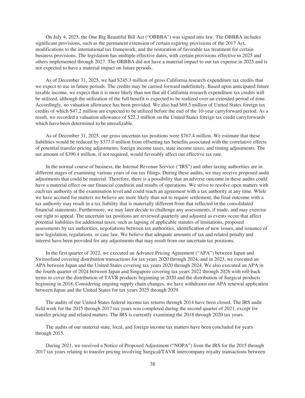 On July 4, 2025, the One Big Beautiful Bill Act (“OBBBA”) was signed into law. The OBBBA includes significant provisions, such as the permanent extension of certain expiring provisions of the 2017 Act, modifications to the international tax framework, and the restoration of favorable tax treatment for certain business provisions. The legislation has multiple effective dates, with certain provisions effective in 2025 and others implemented through 2027. The OBBBA did not have a material impact to our tax expense in 2025 and is not expected to have a material impact on future periods. As of December 31, 2025, we had $245.3 million of gross California research expenditure tax credits that we expect to use in future periods. The credits may be carried forward indefinitely. Based upon anticipated future taxable income, we expect that it is more likely than not that all California research expenditure tax credits will be utilized, although the utilization of the full benefit is expected to be realized over an extended period of time. Accordingly, no valuation allowance has been provided. We also had $69.5 million of United States foreign tax credits of which $47.2 million are expected to be utilized before the end of the 10-year carryforward period. As a result, we recorded a valuation allowance of $22.3 million on the United States foreign tax credit carryforwards which have been determined to be unrealizable. As of December 31, 2025, our gross uncertain tax positions were $767.4 million. We estimate that these liabilities would be reduced by $377.0 million from offsetting tax benefits associated with the correlative effects of potential transfer pricing adjustments, foreign income taxes, state income taxes, and timing adjustments. The net amount of $390.4 million, if not required, would favorably affect our effective tax rate. In the normal course of business, the Internal Revenue Service (“IRS”) and other taxing authorities are in different stages of examining various years of our tax filings. During these audits, we may receive proposed audit adjustments that could be material. Therefore, there is a possibility that an adverse outcome in these audits could have a material effect on our financial condition and results of operations. We strive to resolve open matters with each tax authority at the examination level and could reach an agreement with a tax authority at any time. While we have accrued for matters we believe are more likely than not to require settlement, the final outcome with a tax authority may result in a tax liability that is materially different from that reflected in the consolidated financial statements. Furthermore, we may later decide to challenge any assessments, if made, and may exercise our right to appeal. The uncertain tax positions are reviewed quarterly and adjusted as events occur that affect potential liabilities for additional taxes, such as lapsing of applicable statutes of limitations, proposed assessments by tax authorities, negotiations between tax authorities, identification of new issues, and issuance of new legislation, regulations, or case law. We believe that adequate amounts of tax and related penalty and interest have been provided for any adjustments that may result from our uncertain tax positions. In the first quarter of 2022, we executed an Advance Pricing Agreement (“APA”) between Japan and Switzerland covering distribution transactions for tax years 2020 through 2024, and in 2023, we executed an APA between Japan and the United States covering tax years 2020 through 2024. We also executed an APA in the fourth quarter of 2024 between Japan and Singapore covering tax years 2022 through 2026 with roll-back terms to cover the distribution of TAVR products beginning in 2020 and the distribution of Surgical products beginning in 2018. Considering ongoing supply chain changes, we have withdrawn our APA renewal application between Japan and the United States for tax years 2025 through 2029. The audits of our United States federal income tax returns through 2014 have been closed. The IRS audit field work for the 2015 through 2017 tax years was completed during the second quarter of 2021, except for transfer pricing and related matters. The IRS is currently examining the 2018 through 2020 tax years. The audits of our material state, local, and foreign income tax matters have been concluded for years through 2015. During 2021, we received a Notice of Proposed Adjustment (“NOPA”) from the IRS for the 2015 through 2017 tax years relating to transfer pricing involving Surgical/TAVR intercompany royalty transactions between 38