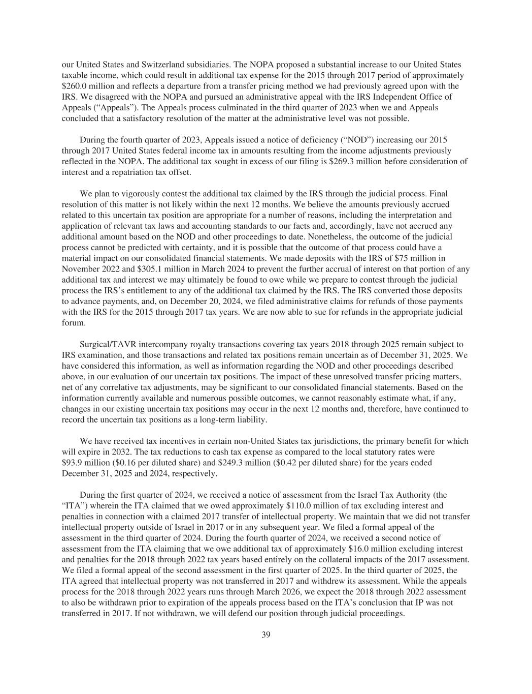 our United States and Switzerland subsidiaries. The NOPA proposed a substantial increase to our United States taxable income, which could result in additional tax expense for the 2015 through 2017 period of approximately $260.0 million and reflects a departure from a transfer pricing method we had previously agreed upon with the IRS. We disagreed with the NOPA and pursued an administrative appeal with the IRS Independent Office of Appeals (“Appeals”). The Appeals process culminated in the third quarter of 2023 when we and Appeals concluded that a satisfactory resolution of the matter at the administrative level was not possible. During the fourth quarter of 2023, Appeals issued a notice of deficiency (“NOD”) increasing our 2015 through 2017 United States federal income tax in amounts resulting from the income adjustments previously reflected in the NOPA. The additional tax sought in excess of our filing is $269.3 million before consideration of interest and a repatriation tax offset. We plan to vigorously contest the additional tax claimed by the IRS through the judicial process. Final resolution of this matter is not likely within the next 12 months. We believe the amounts previously accrued related to this uncertain tax position are appropriate for a number of reasons, including the interpretation and application of relevant tax laws and accounting standards to our facts and, accordingly, have not accrued any additional amount based on the NOD and other proceedings to date. Nonetheless, the outcome of the judicial process cannot be predicted with certainty, and it is possible that the outcome of that process could have a material impact on our consolidated financial statements. We made deposits with the IRS of $75 million in November 2022 and $305.1 million in March 2024 to prevent the further accrual of interest on that portion of any additional tax and interest we may ultimately be found to owe while we prepare to contest through the judicial process the IRS’s entitlement to any of the additional tax claimed by the IRS. The IRS converted those deposits to advance payments, and, on December 20, 2024, we filed administrative claims for refunds of those payments with the IRS for the 2015 through 2017 tax years. We are now able to sue for refunds in the appropriate judicial forum. Surgical/TAVR intercompany royalty transactions covering tax years 2018 through 2025 remain subject to IRS examination, and those transactions and related tax positions remain uncertain as of December 31, 2025. We have considered this information, as well as information regarding the NOD and other proceedings described above, in our evaluation of our uncertain tax positions. The impact of these unresolved transfer pricing matters, net of any correlative tax adjustments, may be significant to our consolidated financial statements. Based on the information currently available and numerous possible outcomes, we cannot reasonably estimate what, if any, changes in our existing uncertain tax positions may occur in the next 12 months and, therefore, have continued to record the uncertain tax positions as a long-term liability. We have received tax incentives in certain non-United States tax jurisdictions, the primary benefit for which will expire in 2032. The tax reductions to cash tax expense as compared to the local statutory rates were $93.9 million ($0.16 per diluted share) and $249.3 million ($0.42 per diluted share) for the years ended December 31, 2025 and 2024, respectively. During the first quarter of 2024, we received a notice of assessment from the Israel Tax Authority (the “ITA”) wherein the ITA claimed that we owed approximately $110.0 million of tax excluding interest and penalties in connection with a claimed 2017 transfer of intellectual property. We maintain that we did not transfer intellectual property outside of Israel in 2017 or in any subsequent year. We filed a formal appeal of the assessment in the third quarter of 2024. During the fourth quarter of 2024, we received a second notice of assessment from the ITA claiming that we owe additional tax of approximately $16.0 million excluding interest and penalties for the 2018 through 2022 tax years based entirely on the collateral impacts of the 2017 assessment. We filed a formal appeal of the second assessment in the first quarter of 2025. In the third quarter of 2025, the ITA agreed that intellectual property was not transferred in 2017 and withdrew its assessment. While the appeals process for the 2018 through 2022 years runs through March 2026, we expect the 2018 through 2022 assessment to also be withdrawn prior to expiration of the appeals process based on the ITA’s conclusion that IP was not transferred in 2017. If not withdrawn, we will defend our position through judicial proceedings. 39