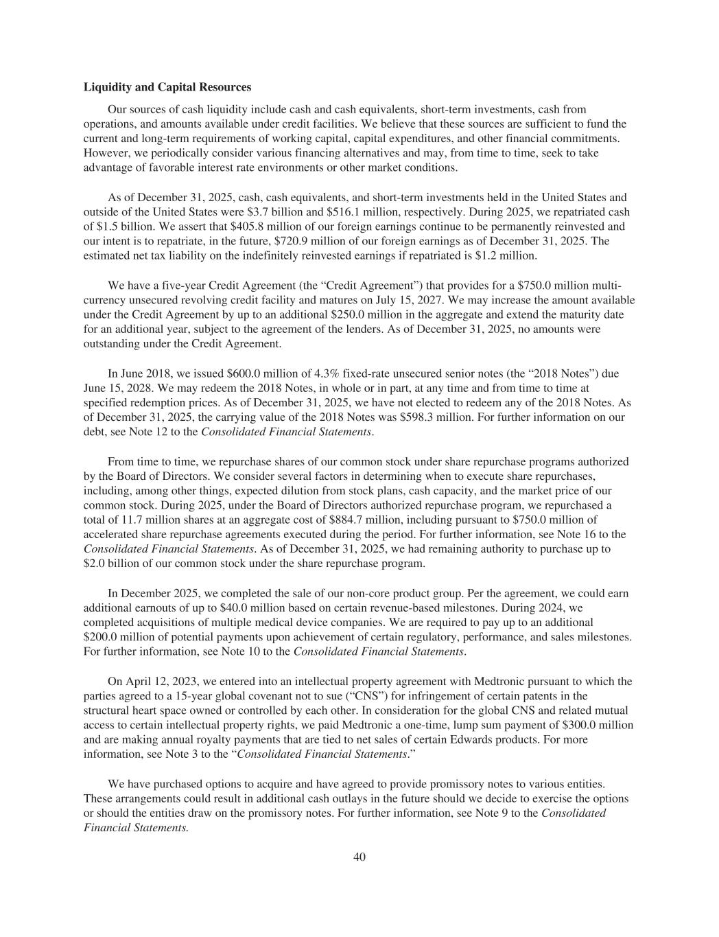 Liquidity and Capital Resources Our sources of cash liquidity include cash and cash equivalents, short-term investments, cash from operations, and amounts available under credit facilities. We believe that these sources are sufficient to fund the current and long-term requirements of working capital, capital expenditures, and other financial commitments. However, we periodically consider various financing alternatives and may, from time to time, seek to take advantage of favorable interest rate environments or other market conditions. As of December 31, 2025, cash, cash equivalents, and short-term investments held in the United States and outside of the United States were $3.7 billion and $516.1 million, respectively. During 2025, we repatriated cash of $1.5 billion. We assert that $405.8 million of our foreign earnings continue to be permanently reinvested and our intent is to repatriate, in the future, $720.9 million of our foreign earnings as of December 31, 2025. The estimated net tax liability on the indefinitely reinvested earnings if repatriated is $1.2 million. We have a five-year Credit Agreement (the “Credit Agreement”) that provides for a $750.0 million multi- currency unsecured revolving credit facility and matures on July 15, 2027. We may increase the amount available under the Credit Agreement by up to an additional $250.0 million in the aggregate and extend the maturity date for an additional year, subject to the agreement of the lenders. As of December 31, 2025, no amounts were outstanding under the Credit Agreement. In June 2018, we issued $600.0 million of 4.3% fixed-rate unsecured senior notes (the “2018 Notes”) due June 15, 2028. We may redeem the 2018 Notes, in whole or in part, at any time and from time to time at specified redemption prices. As of December 31, 2025, we have not elected to redeem any of the 2018 Notes. As of December 31, 2025, the carrying value of the 2018 Notes was $598.3 million. For further information on our debt, see Note 12 to the Consolidated Financial Statements. From time to time, we repurchase shares of our common stock under share repurchase programs authorized by the Board of Directors. We consider several factors in determining when to execute share repurchases, including, among other things, expected dilution from stock plans, cash capacity, and the market price of our common stock. During 2025, under the Board of Directors authorized repurchase program, we repurchased a total of 11.7 million shares at an aggregate cost of $884.7 million, including pursuant to $750.0 million of accelerated share repurchase agreements executed during the period. For further information, see Note 16 to the Consolidated Financial Statements. As of December 31, 2025, we had remaining authority to purchase up to $2.0 billion of our common stock under the share repurchase program. In December 2025, we completed the sale of our non-core product group. Per the agreement, we could earn additional earnouts of up to $40.0 million based on certain revenue-based milestones. During 2024, we completed acquisitions of multiple medical device companies. We are required to pay up to an additional $200.0 million of potential payments upon achievement of certain regulatory, performance, and sales milestones. For further information, see Note 10 to the Consolidated Financial Statements. On April 12, 2023, we entered into an intellectual property agreement with Medtronic pursuant to which the parties agreed to a 15-year global covenant not to sue (“CNS”) for infringement of certain patents in the structural heart space owned or controlled by each other. In consideration for the global CNS and related mutual access to certain intellectual property rights, we paid Medtronic a one-time, lump sum payment of $300.0 million and are making annual royalty payments that are tied to net sales of certain Edwards products. For more information, see Note 3 to the “Consolidated Financial Statements.” We have purchased options to acquire and have agreed to provide promissory notes to various entities. These arrangements could result in additional cash outlays in the future should we decide to exercise the options or should the entities draw on the promissory notes. For further information, see Note 9 to the Consolidated Financial Statements. 40
