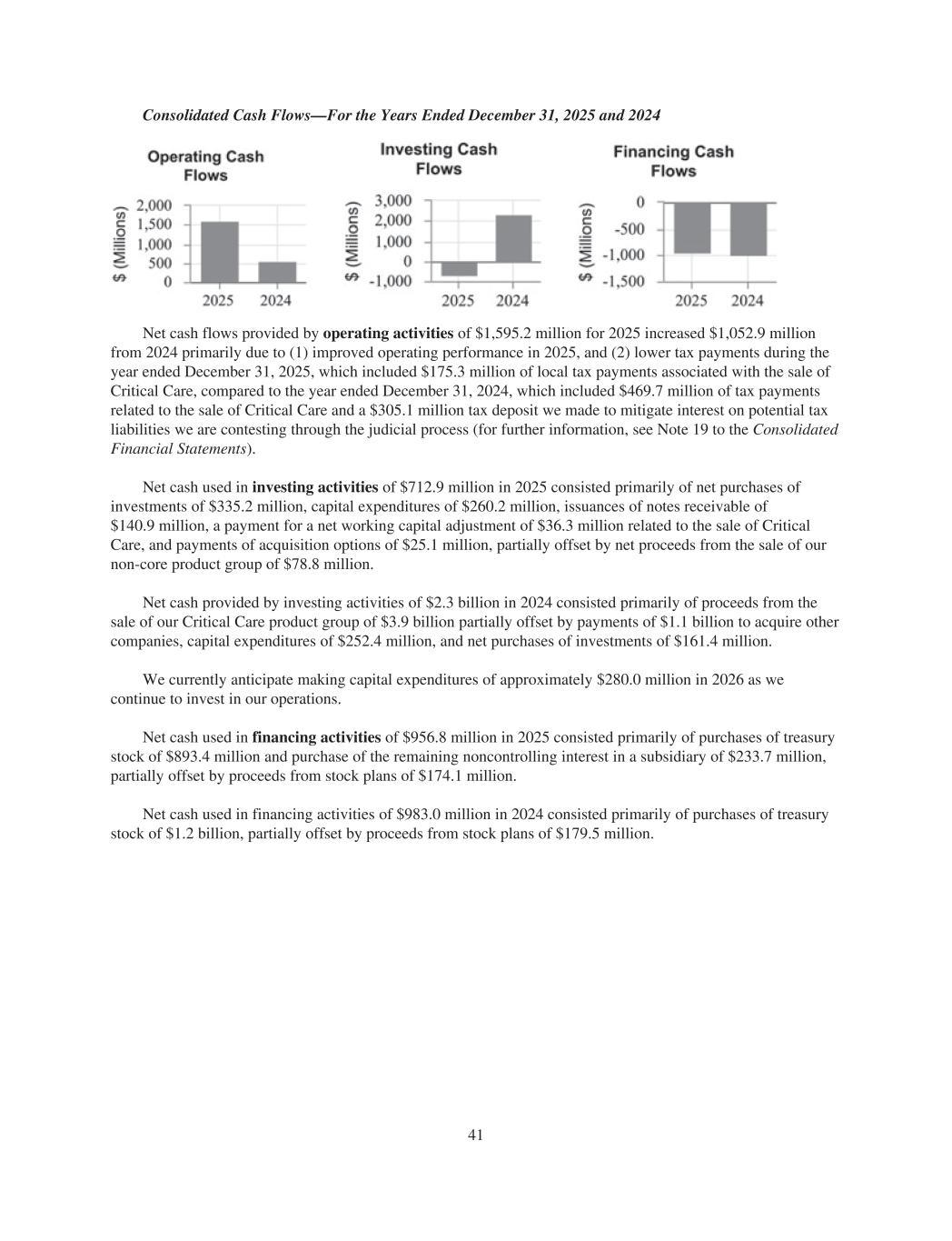 Consolidated Cash Flows—For the Years Ended December 31, 2025 and 2024 Net cash flows provided by operating activities of $1,595.2 million for 2025 increased $1,052.9 million from 2024 primarily due to (1) improved operating performance in 2025, and (2) lower tax payments during the year ended December 31, 2025, which included $175.3 million of local tax payments associated with the sale of Critical Care, compared to the year ended December 31, 2024, which included $469.7 million of tax payments related to the sale of Critical Care and a $305.1 million tax deposit we made to mitigate interest on potential tax liabilities we are contesting through the judicial process (for further information, see Note 19 to the Consolidated Financial Statements). Net cash used in investing activities of $712.9 million in 2025 consisted primarily of net purchases of investments of $335.2 million, capital expenditures of $260.2 million, issuances of notes receivable of $140.9 million, a payment for a net working capital adjustment of $36.3 million related to the sale of Critical Care, and payments of acquisition options of $25.1 million, partially offset by net proceeds from the sale of our non-core product group of $78.8 million. Net cash provided by investing activities of $2.3 billion in 2024 consisted primarily of proceeds from the sale of our Critical Care product group of $3.9 billion partially offset by payments of $1.1 billion to acquire other companies, capital expenditures of $252.4 million, and net purchases of investments of $161.4 million. We currently anticipate making capital expenditures of approximately $280.0 million in 2026 as we continue to invest in our operations. Net cash used in financing activities of $956.8 million in 2025 consisted primarily of purchases of treasury stock of $893.4 million and purchase of the remaining noncontrolling interest in a subsidiary of $233.7 million, partially offset by proceeds from stock plans of $174.1 million. Net cash used in financing activities of $983.0 million in 2024 consisted primarily of purchases of treasury stock of $1.2 billion, partially offset by proceeds from stock plans of $179.5 million. 41